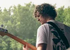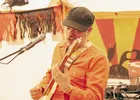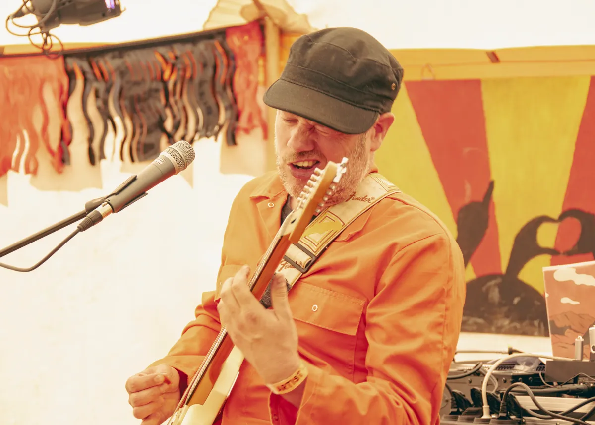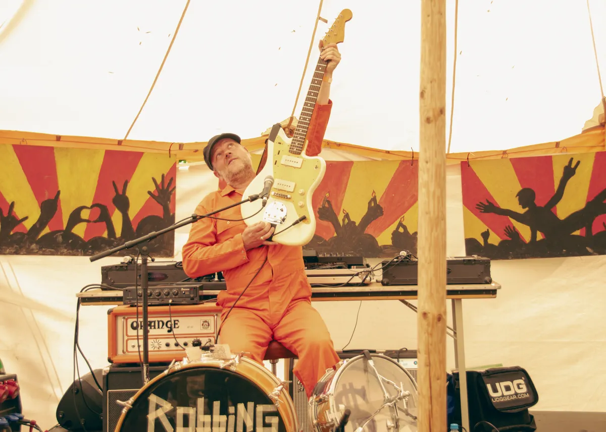 Zelfs Robbing Banks is in het oranje gekleed. In dit geval hoort het overigens bij zijn act: Alsof hij een bank heeft overvallen en als gevangene een oranje pak aan heeft gekregen. Van buiten de tent verwacht je dat er drie man op het podium staat. Er is immers een elektrische gitaar te horen, een drumstel en een vocalist. Maar wanneer je een kijkje neemt blijkt er maar één iemand te zitten. Dat is Robin van Saaze, een one-manband uit Utrecht. Hij bespeelt de drum en gitaar tegelijk, en zingt er ook nog eens bij alsof het geen moeite kost. Inspiratie haalt Robbing Banks uit bands als Weezer en Smashing Pumpkins, en hij creëert garagerock waarop je hard wil meestampen. Uit de teksten van Fashion (Ain’t No Friend of Mine) en Got Love Need Money is te merken dat Robin moeite heeft om met de tijd, trends en maatschappij mee te gaan. Tegen het eind van de set heeft hij nog vier minuten om acht nummers te spelen. Dan maar een maatje sneller!