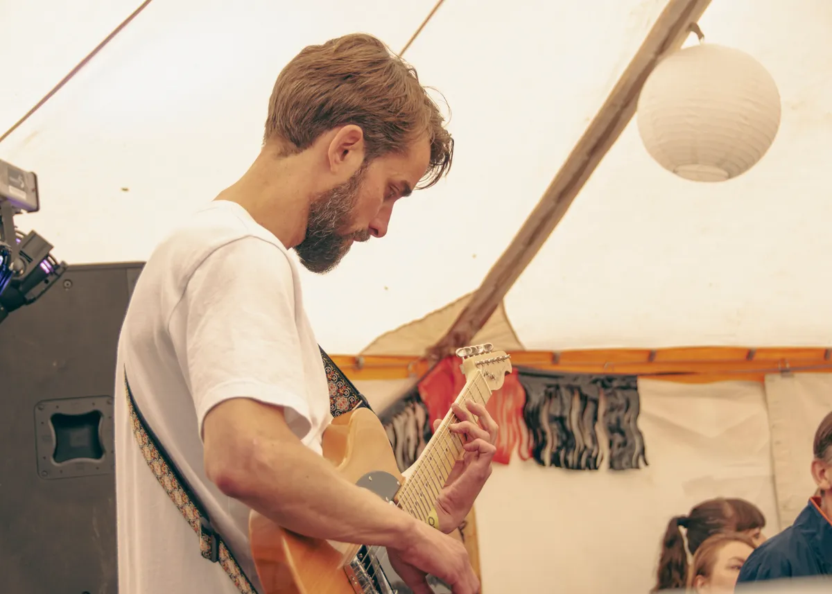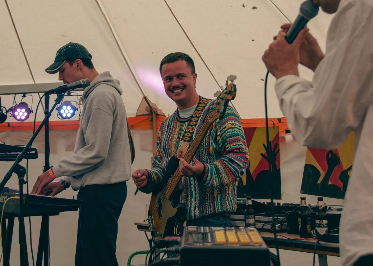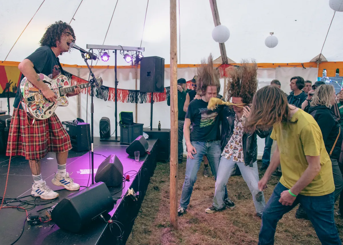 Op het Grondslagveldje kun je je best een dagje vertoeven. Naast de optredens zijn er spelletjes te spelen, biertjes te drinken en burgers te eten, er staat er een beuk-caravan voor de technoliefhebber, of je kunt jezelf terugtrekken in een loungestoel. Er lopen ouders met jonge kinderen over het terrein, hun kleine oortjes beschermd tegen de luide muziek door een koptelefoon. Ook de voetbalfans missen niks, want de wedstrijd Nederland-Turkije wordt uitgezonden vanuit de tent. Een deel van de bezoekers heeft hier zijn outfit op afgestemd. We zien voetbalpakjes, grote oranje pruiken en rood-wit-blauwe cowboyhoeden.