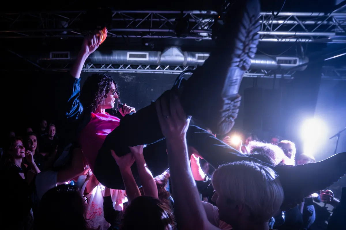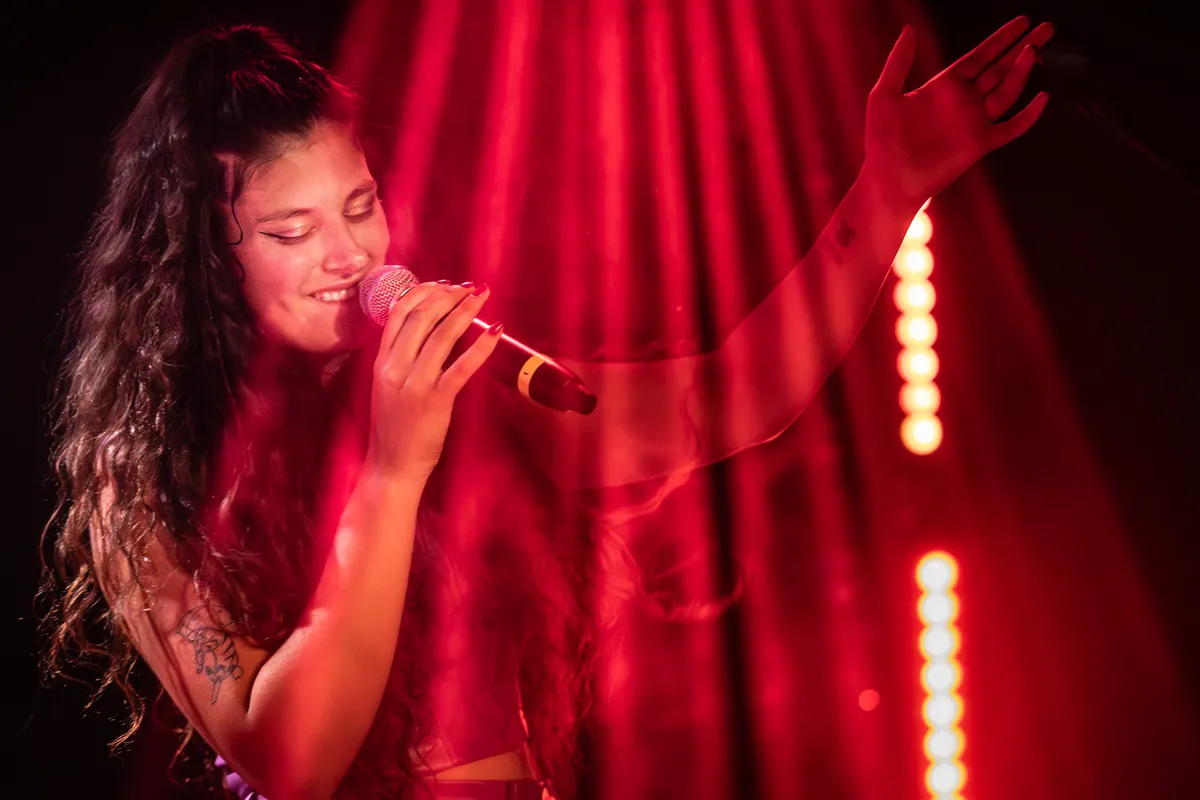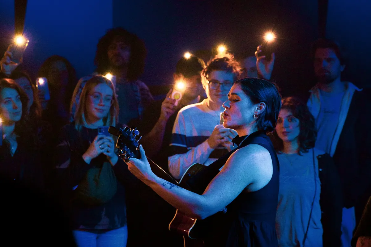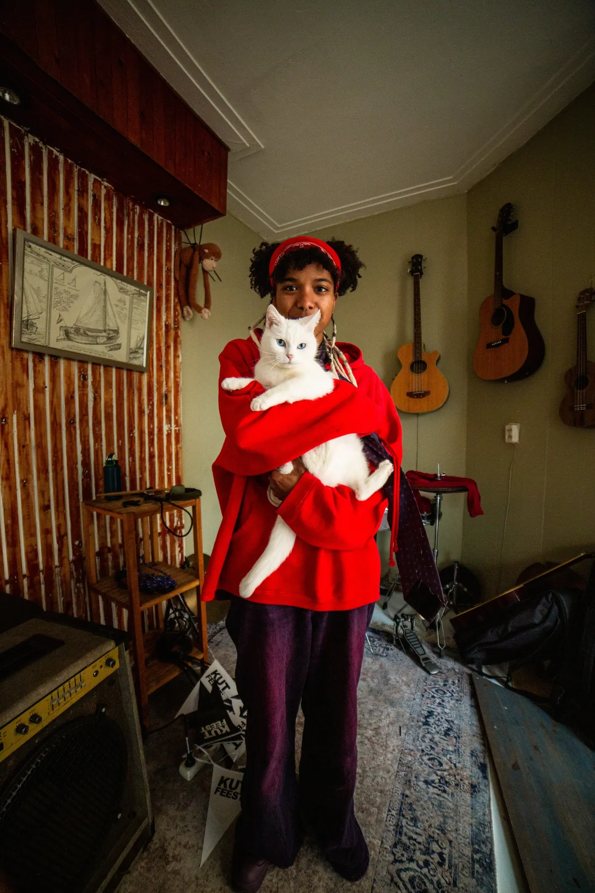 Het welkomstcomité staat bij het binnenlopen al klaar: de vriendelijke witte viervoeter Milo. Achter Milo staat een net zo vriendelijke jonge dame met een uitgesproken stijl, zowel in haar muziek als in haar kleding. Samen met twee anderen woont ze in een antikraakpand, met zoveel Perzische tapijten dat de vloer nauwelijks nog zichtbaar is. Aan creativiteit geen gebrek: samen timmerden ze een heuse boulderkamer in elkaar, richtten ze een houtbewerkingsruimte in voor de nodige klusprojecten, en in de woonkamer prijkt zelfs een podium. Hoe langer je rondkijkt, hoe meer je ontdekt- en hoe groter je nieuwsgierigheid naar de vrouw die hier zo onmiskenbaar thuis is.