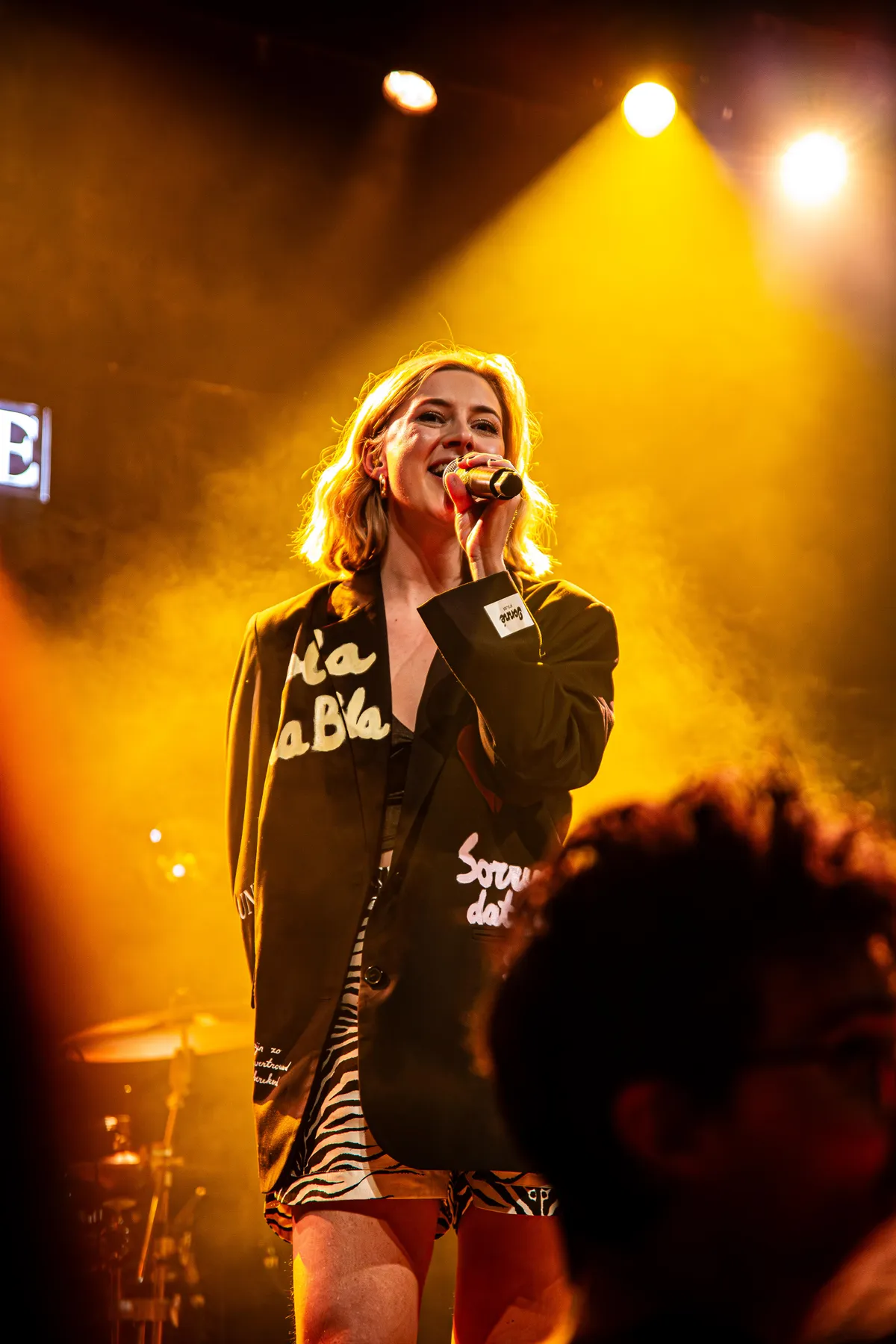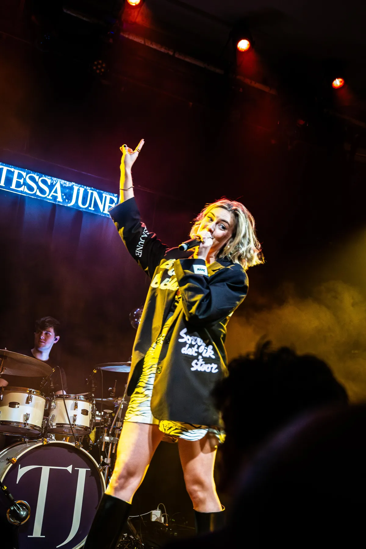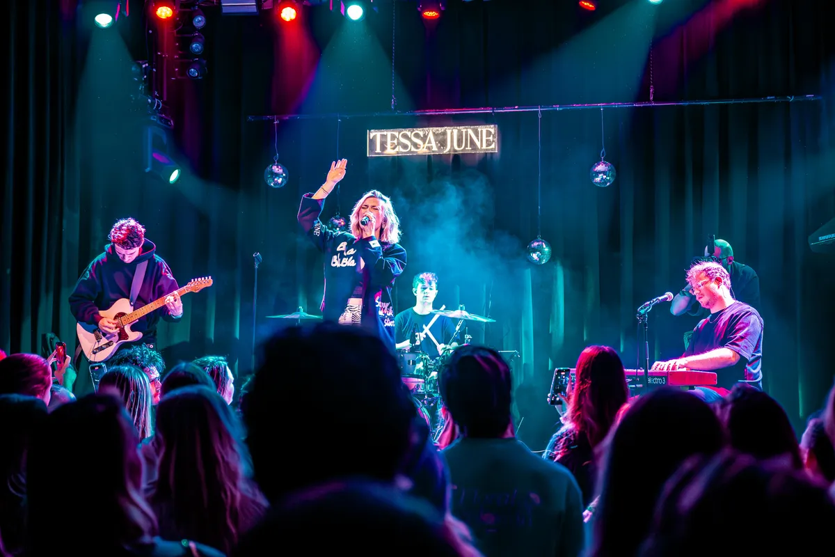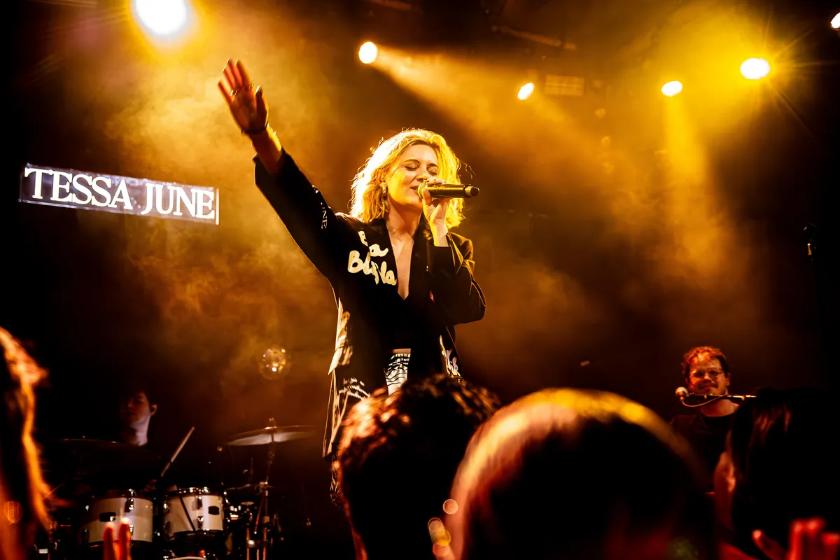 Aan details geen gebrek. Achter Tessa June en haar band staat een lichtbak met haar logo, zelfs op het bassdrumvel prijken haar initialen. Haar kleding is afgestemd op de sfeer; op haar jasje zijn titels van haar nummers geborduurd. Ook kleine onvolkomenheden dragen bij aan de echtheid van de avond. Zo is er het plan om wegwerpcamera’s uit te delen om samen foto’s te maken en die later te delen. Halverwege de show blijkt dat dat niet is gelukt. Tessa June laat het er niet bij zitten: ze pakt haar kansen.