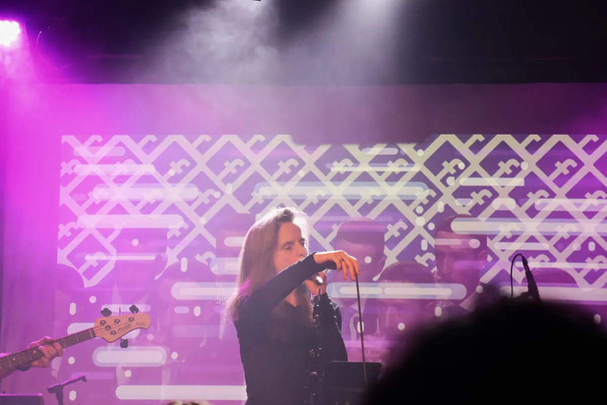 Het podium staat volgepakt met zes muzikanten en hun instrumenten, het achterdoek is wit. Maar dat blijft niet lang zo, want gedurende het optreden worden bij de nummers passende video’s of visuals vertoond.