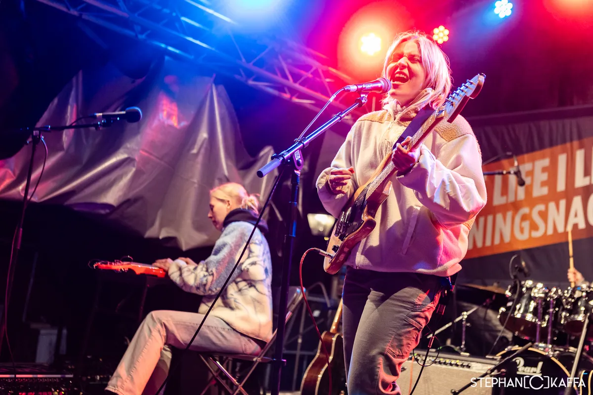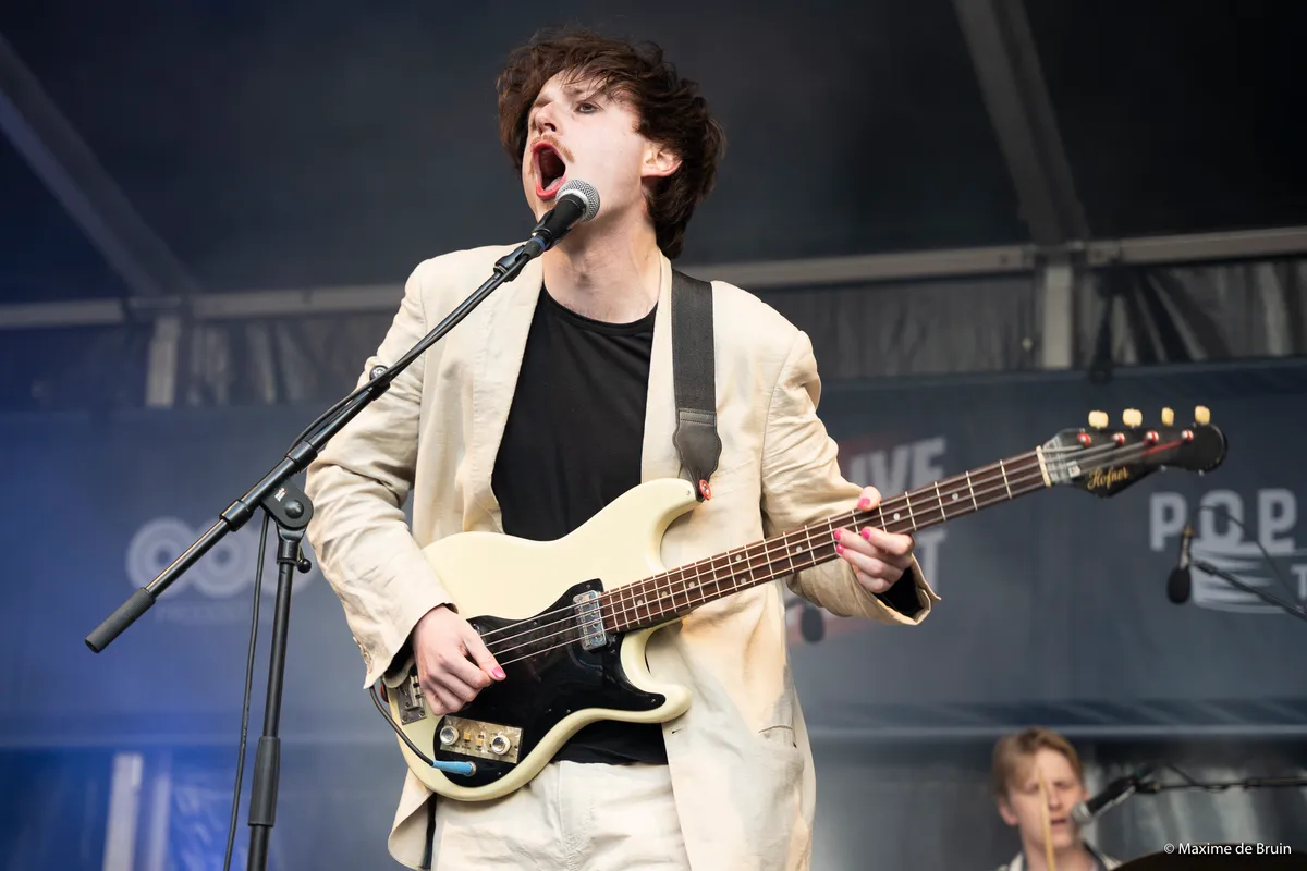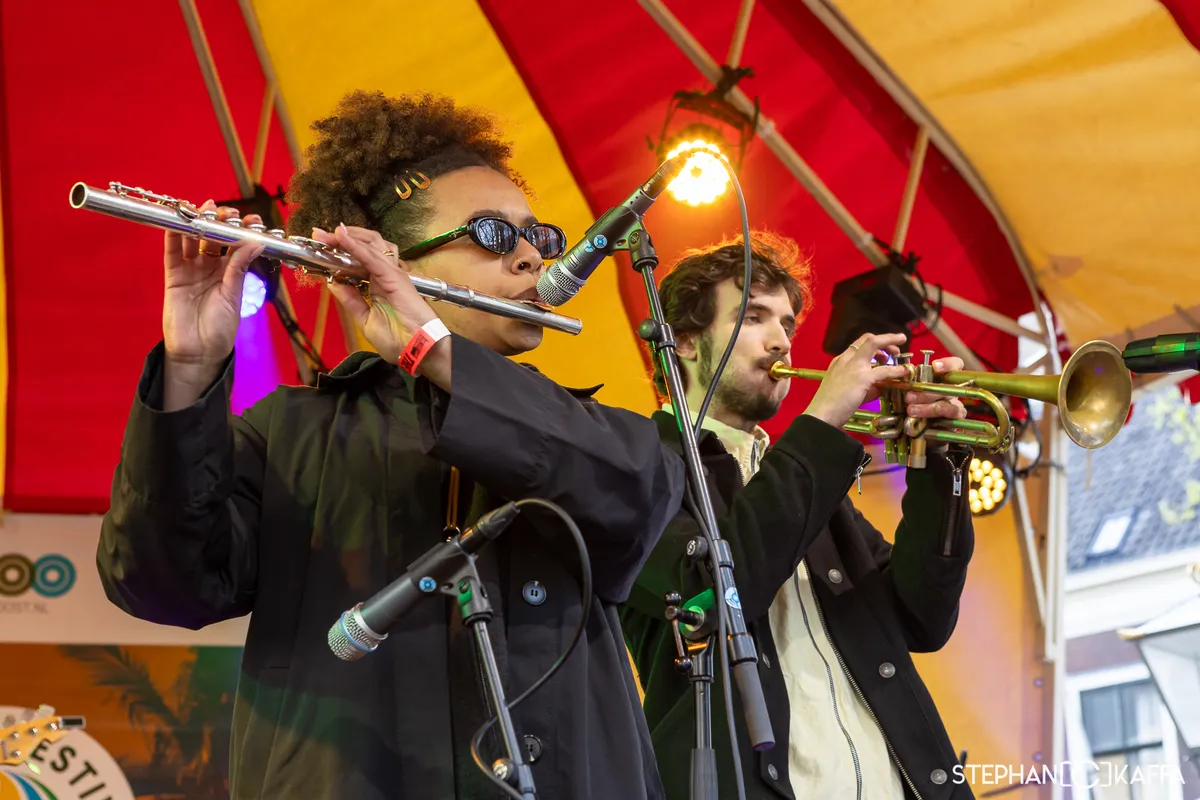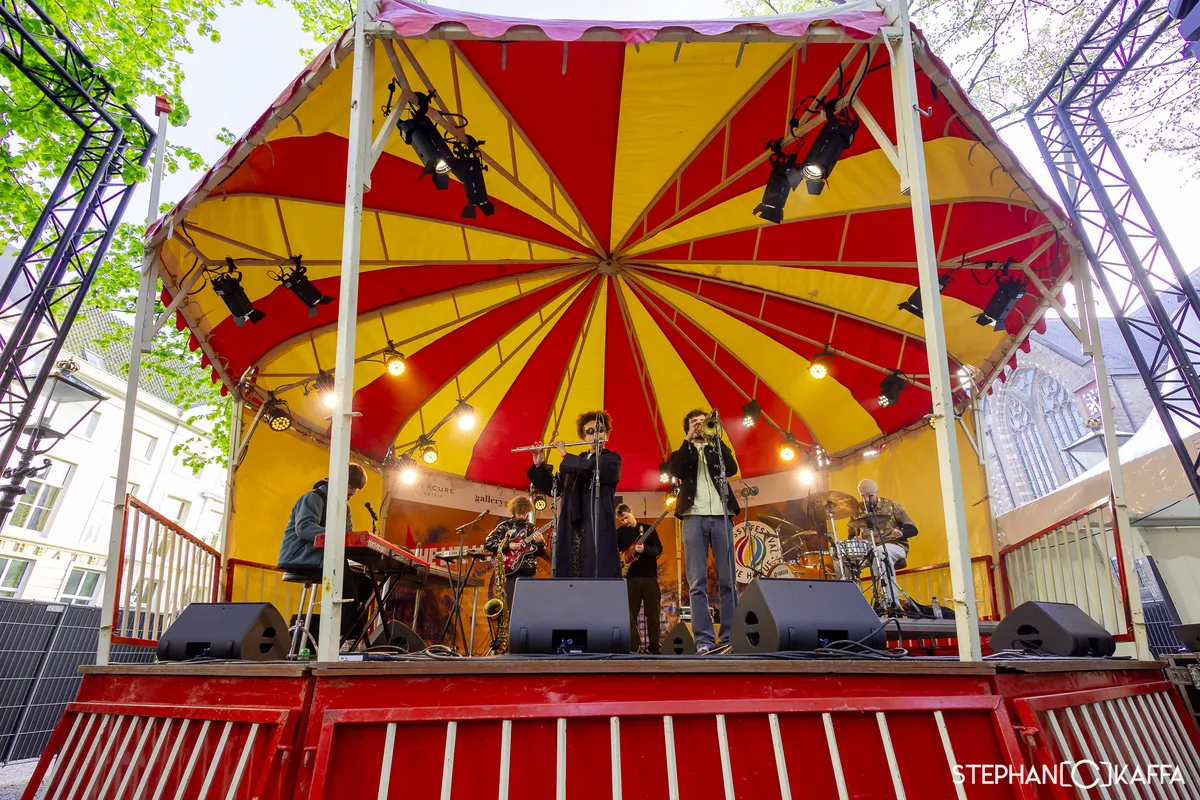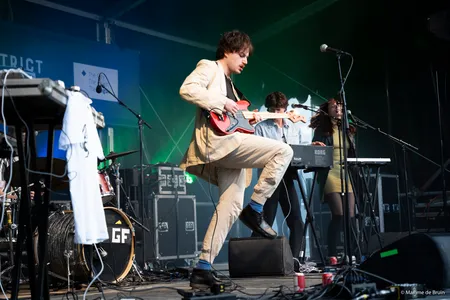 Terwijl Brintex Collective hun merk van ingewikkelde akkoorden afmaakt, pikken we het laatste beetje zonneschijn mee bij My Girlfriend. Deze gitaarloze Haagse band mag het podium bij de Grote Markt aftrappen. Met gierende keyboardtoetsen en de stuwende basnoten van frontman Gijs Schouten laat de groep gelijk zien dat ze een waardige opener zijn van het Sniesterpodium. Die-hard fans voorin en nieuwe gezichten verspreid over het plein. En zelfs zijn ‘lieve moeder’ staat in het publiek. We worden vooral warm op de momenten waar de tweesnarige basgitaar tevoorschijn komt. Dan is de energie op het podium op zijn hoogtepunt. Dit is gewoon een lekkere band met een hoog gunniveau. Zo licht Gijs bij 'Milkshake Maker' toe dat hij continu een tweestrijd voert tussen suiker en het feit dat hij een diabeet is. Wanneer Gijs op het drumstel wil gaan staan, valt hij geheel subtiel over de drums. Sorry! En zo krijgt het prima optreden een ongemakkelijk einde.