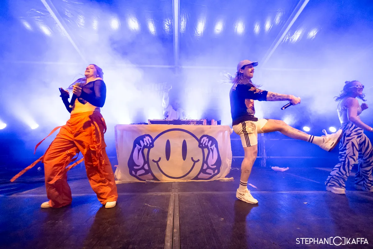 ‘We gaan zo een half uur stampen’, zegt zangeres Robin tijdens de soundcheck van MOJO FYRE. We hebben dan al wat pompende beats gehoord die in de jaren 90 niet hadden misstaan. Nu is het, voor we verder gaan, misschien tijd om even open kaart te spelen: binnen het verslagteam waren de meningen over het optreden dat volgde verdeeld. Helaas voor enkelen van hen is uw recensent opgegroeid in de jaren 90 en groot liefhebber van happy hardcore, en dat is precies wat we krijgen. MOJO FYRE wisselt eigen werk af met klassiekers als ‘Hardcore Vibes’ en ‘Wonderful Days’. Daarmee is het optreden een feest der herkenning is waar de eigen nummers naadloos tussen passen. Voor het podium blijken velen het gabberen, ondanks de regen die steeds heviger wordt, niet verleerd te zijn. Anderen hebben meer moeite, maar dat mag de pret niet drukken. Na afloop concluderen we: Robin had gelijk. Dit was een half uur ongenuanceerd, pretentieloos stampen. En wat was het lekker.