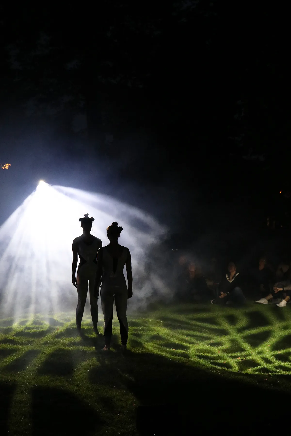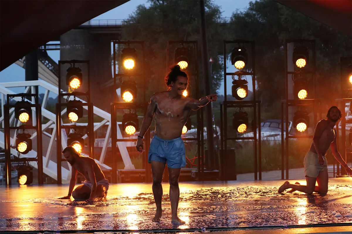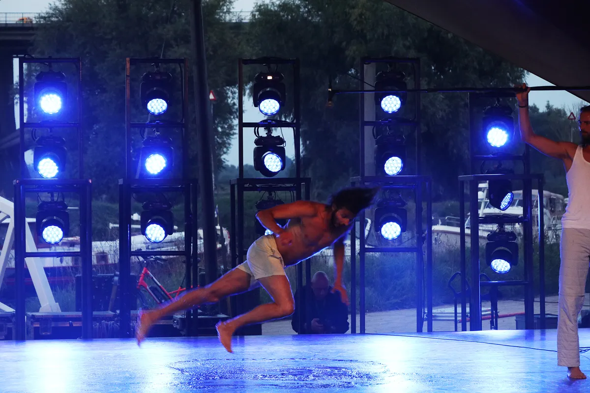 In het Valkhofpark nemen de luchtacrobaten van Zirkometric hun publiek mee in een hypnotiserend spel met hoepels en stellages en spannende lichteffecten. Het ziet er vederlicht uit, maar straalt tegelijk enorme kracht uit.