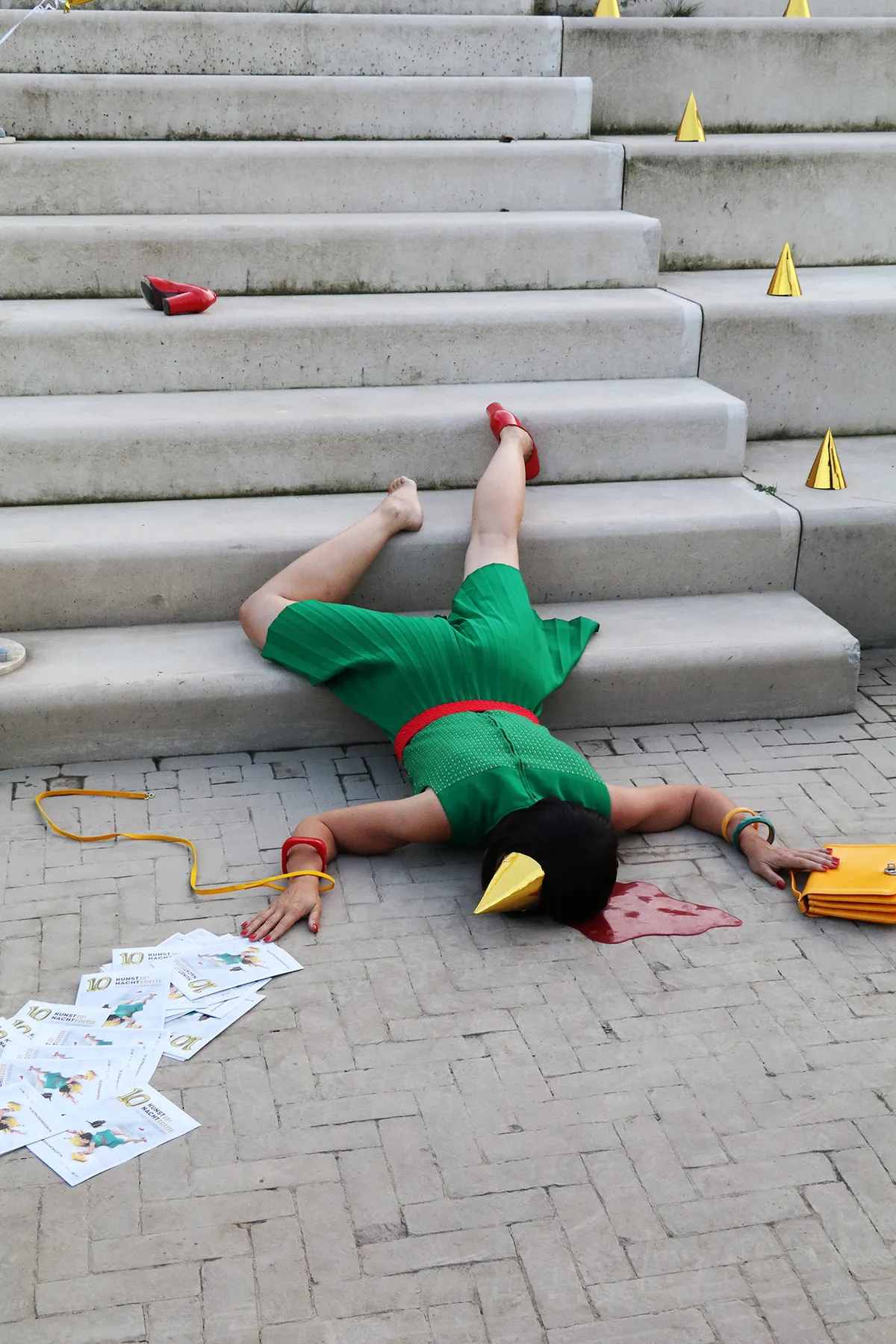 De openingsact vindt plaats op de Waalkade. Daar ligt ook de mascotte van de Kunstnacht, de gevallen vrouw met haar groengeruite jurkje (een rol van performancekunstenaar Leander Haaitsma). Terwijl Kim Uittenhout, de drijvende kracht achter de Kunstnacht, verrast wordt met een bos bloemen staat de vrouw in het groen plotseling op en loopt weg. Ontzettend knap, hoe lang zij daar in die ongemakkelijke houding op die koude stenen trap heeft gelegen.