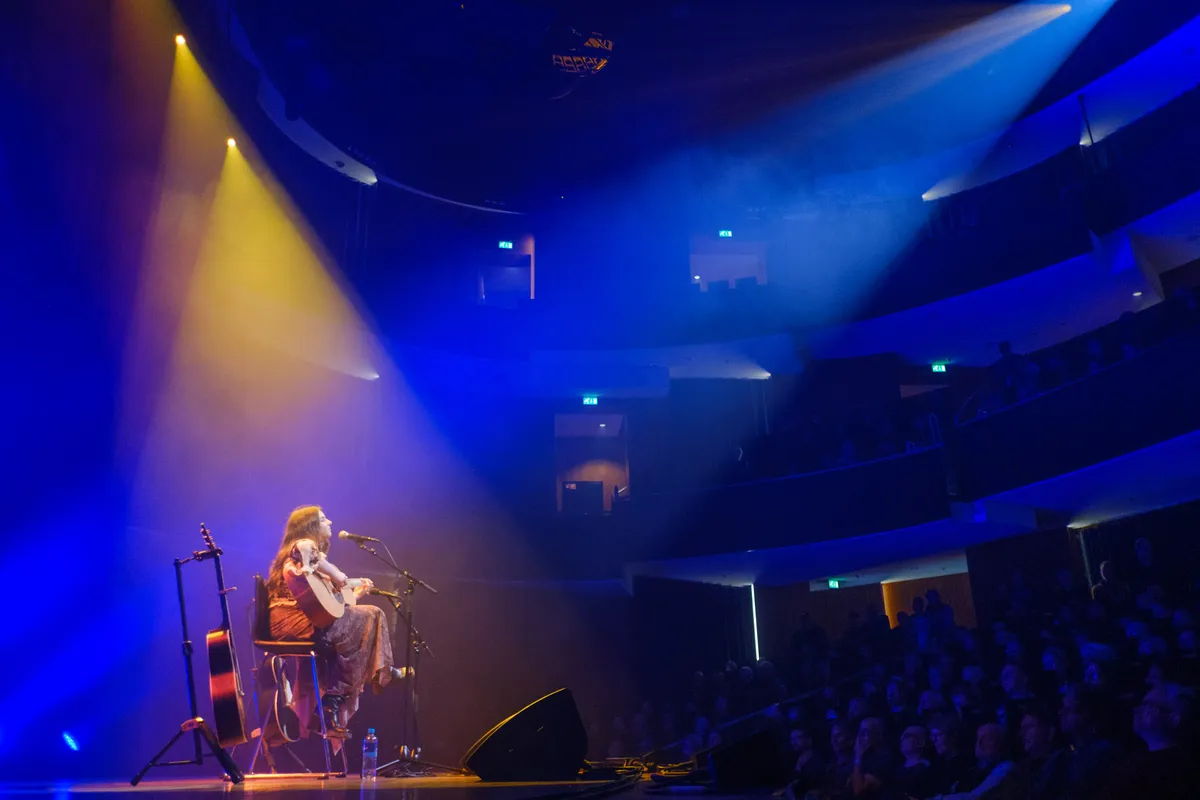 Door de sfeerervaringen in de Hertz, Cloud Nine en Club Nine, lijkt de grote zaal eerst wel erg groot voor een artiest als Mary Gauthier en haar instrumentarium: slechts met een eigen gitaar en haar muzikale metgezel, singer-songwriter Jaimee Harris. Het wordt snel duidelijk dat er verder niet veel nodig is om de zaal te vullen met de intimiteit van haar levensverhalen. Verpakt in pakkende teksten als ‘Alcohol and adarell, prides comes before the fall’ en ‘Steam Train was the king, The last of the hobo kings’, neemt Mary het publiek naar het rauwe hedendaagse Amerika. Met het nummer ‘Dark Enough to see the Stars‘, geeft ze een ode aan een quote van Martin Luther King: ‘’Only in the darkness can you see the stars’’. Mary trekt een snelle parallel met de huidige situatie in de Verenigde Staten, ‘’because where I live, it is pretty dark right now’’.