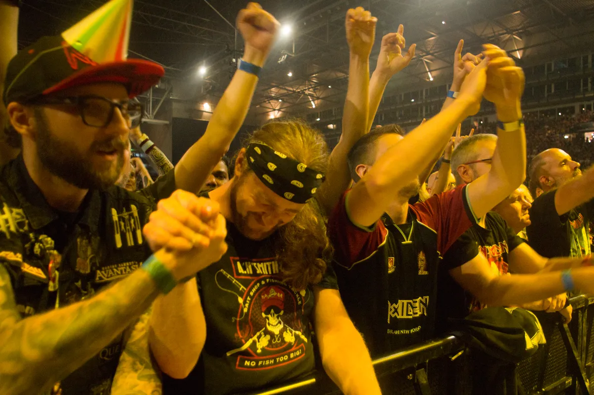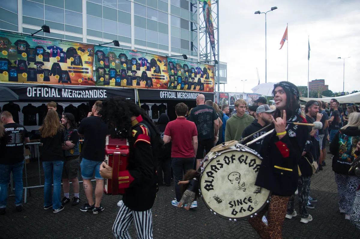 De pleinen rond het Arnhemse Gelredome kleuren in de middag al zwart met een opvallend multigenerationeel publiek in iconische zwart-rode IM-shirts. Een fikse regenbui zorgt ongetwijfeld voor een extra piek in de merch-verkoop, waar men zich kan verzekeren van een droog, nieuw shirt alvorens men de zaal betreedt. Waar er bij metal-clubshows een ongeschreven regel geldt dat je geen shirt draagt van de band die speelt, is die memo bij Iron Maiden-fans nooit aangekomen. Een zee van Maiden-shirts geeft een gevoel van eenheid. Dat wordt nog eens versterkt door het ontbreken van speciale vakken op het terrein. Vorige maand bij Linkin Park was ditzelfde veld nog opgedeeld in verscheidene tiers aan VIP-areas. Het is fijner zonder.