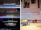 Rondkijkend valt gelijk de lichtinstallatie op. Zes laaghangende langgerekte lichtbakken waarin verschillende kleuren licht ritmisch pulseren.