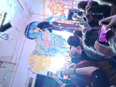 Dan schiet de neon-verlichting aan. ‘Meltheads’ staat roze verlicht achter op het podium. ‘’Meltheads’ show will begin in 10 seconds,’’ klinkt door de zaal. We tellen af. De drummer, Simon de Geus, springt bij nul op zijn krukje en slaat bijna zijn drumstel aan gort. Na twee maten duikt de gitarist, Yunas de Proost, het podium op. Niet lang daarna verschijnt, bassist, Tim Penseart naast zijn bandgenoten. Als laatst betreedt Sietse het strijdtoneel. Ze staan er. En dan… Boem! Zo barst de band uit elkaar en valt er een lawine aan keiharde post-punk over het publiek heen. Dit vuur houden ze wonderbaarlijk genoeg het gehele concert vast. De onvermoeibare Sietse laat hier zijn kracht zien.