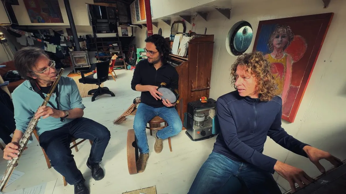 De afgelopen jaren bracht Pieter verschillende albums uit met zijn ensemble Windstreken, waarmee hij in verschillende bezettingen optrad. Vorige maand verscheen zijn nieuwste plaat, met een nieuw trio. De titel ‘Windstil’ lijkt een lichte hint naar een contrast met zijn vorige ensemble. “Windstreken is wat stil komen te liggen toen twee bandleden naar het buitenland verhuisden, kort voor de coronatijd,” vertelt Pieter de Mast in zijn Leidse woonkamer.“ Ik schreef wat nieuwe stukken en begon die te oefenen samen met Sebastiaan, met wie ik destijds mede-oprichter van Windstreken was. Toen we die stukken in 2020 gingen opnemen, hebben we Modar erbij gevraagd als percussionist. Maar het is niet ‘Trio Windstreken’, het is wel echt iets anders. Vandaar deze naam.”
