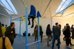 “De beste insights komen na een feestje. Dan ga je ‘s avonds in een speeltuin hele diepe gesprekken hebben.”, begint Marina terwijl we naar een kleurrijk klimrek kijken. “Dit werk heet Monkey Bars, het is heel wankel. Bij de opening van een expositie in Eindhoven was er een dronken jongen die hier helemaal in los ging. Ik weet dat hij daarvoor bedoeld is, maar zo sterk was het niet.” Lachend laat ze op een filmpje zien hoe ze in haar eigen creatie hangt: “Ik kon niet te hard zwiepen.”
