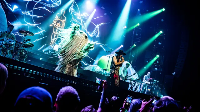 In de change-over komt steeds meer tevoorschijn van Empire of the Sun. Er komt een drumkit, keyboard en een onthulling van twee grote inflatables: een hoofd en een hand. Dan wordt de zaal donker, begint een filmpje op het ledscherm te spelen, komen de artiesten op en kan de show beginnen. Licht, geluid, ledscherm, dansers, kostuums, hoofdtooi, je zou bijna vergeten dat er een band staat. Je zintuigen worden overdonderd met iets wat alleen te omschrijven is als een epileptische aanval. Niet iedereen kan het verdragen, maar het is er wel eentje waar je naar hunkert.