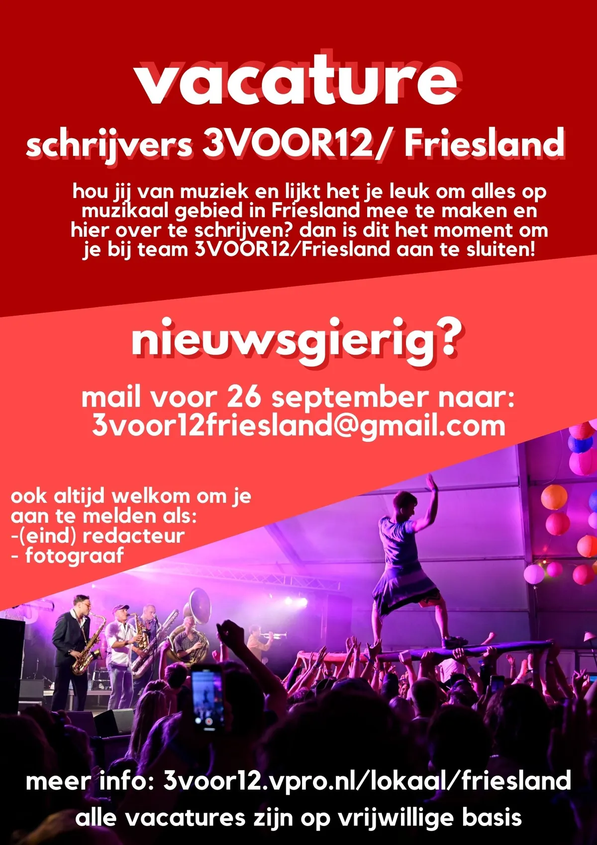 3VOOR12/Friesland is het online pop- magazine voor Friesland, verzorgd door de VPRO. Wekelijks vind je op onze site interviews, aankondigingen en recensies van concerten en festivals, album en demo recensies, fotoreportages en meer. 3voor12 Friesland wordt volledig gerund door enthousiaste vrijwilligers. Heb jij ook zin om te schrijven over popmuziek, neem dan contact op met de redactie. We zijn altijd op zoek naar leuke en goede schrijvers en fotografen! Geïnteresseerd? Meld je dan nu aan!