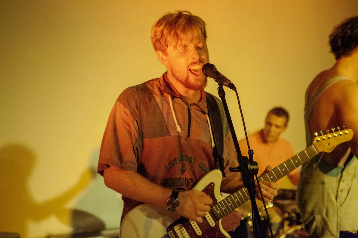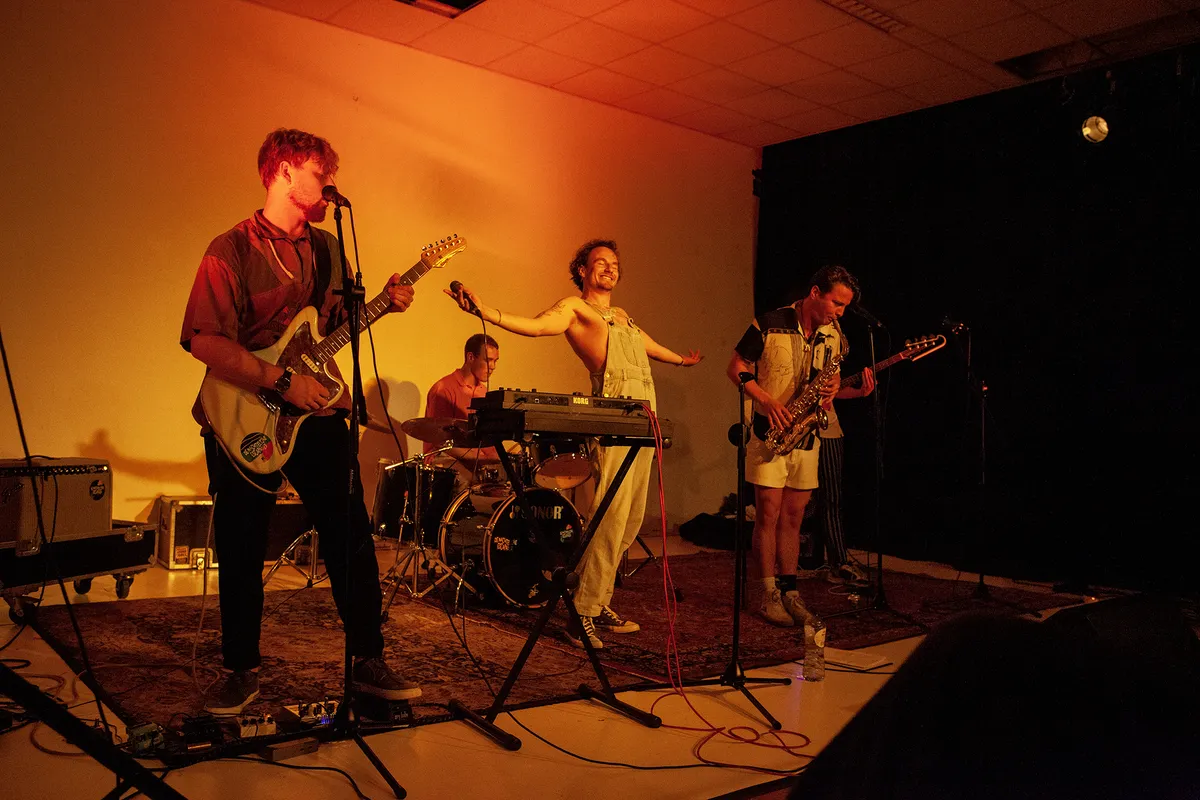 Na dit rockgeweld moeten we even bijkomen en neemt Sabine ons mee naar een schaars verlichte chillruimte, alwaar ‘de bar open is’ – lees: je zelf drankjes uit een koelkast mag halen en op een lijstje schrijven wat je consumeert. Uitgerust en gesterkt gaan we vervolgens naar De Nachtelijke Escapades, die met een mix van Nederlandstalige funk en hiphop een strakke set neerzetten. Met hun single ‘Vliegen vallend door de lucht’ als opener zit de sfeer er meteen goed in. Vervolgens komen ook wat nieuwe, minder bekende nummers voorbij, die minstens zo opzwepend werken. Zo te zien hebben de mannen het op het podium ook enorm naar hun zin met elkaar. We zouden best willen meespringen zoals frontman Daniël doet, maar helaas... vanwege corona kan dat nog even niet.