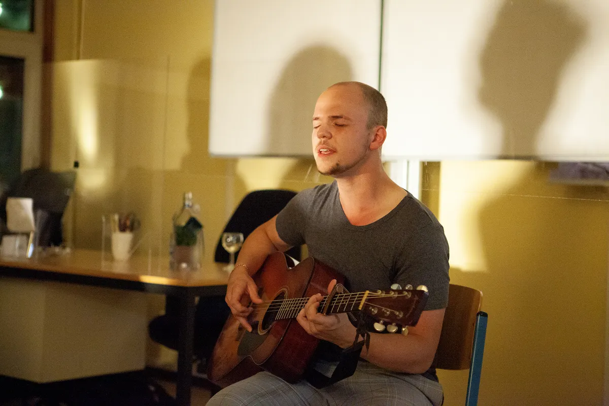 Ook bij Thomas Scherder mag je meezingen. Hij is derdejaars student aan het conservatorium van Codarts en treedt op onder de vlag van pop-upfestival Leidse Lijsters. Met zang en akoestische gitaar brengt hij onder meer een ode aan het werk van Gerry Rafferty. “U weet wel , van ‘Bakerstreet’, met die saxofoon.” We zitten in een kring om hem heen en er ontstaat een gezellige kampvuurvibe. Maar Thomas heeft meer in zijn mars dan covers spelen. Het meest weet hij te raken met een eigen folknummer, waarin hij beschrijft hoe hij graag contact wil met andere reizigers in de trein, maar blijkbaar niemand daar op zit te wachten. Jammer dat het bij dat ene eigen nummer bleef, want dit smaak naar meer...