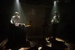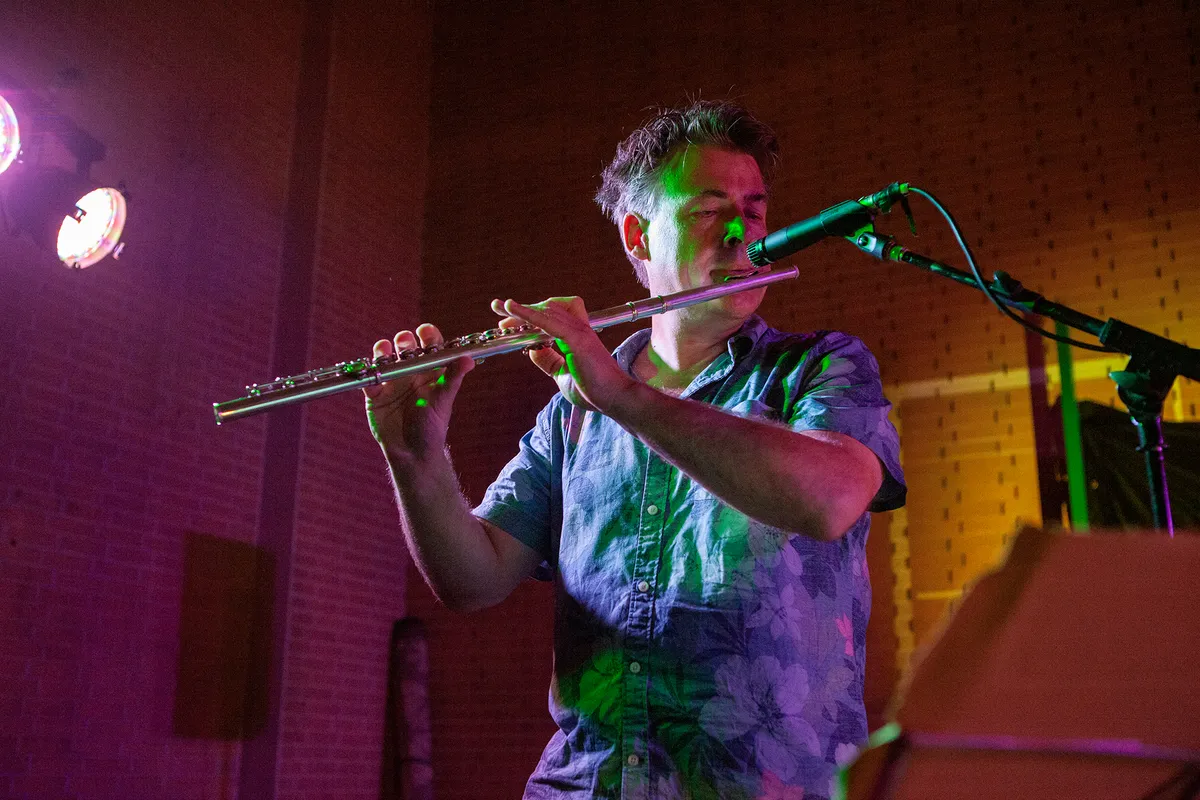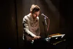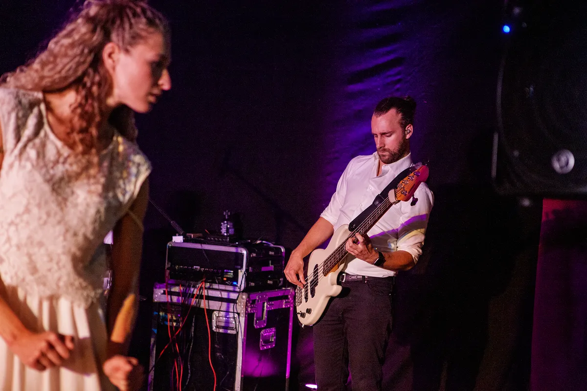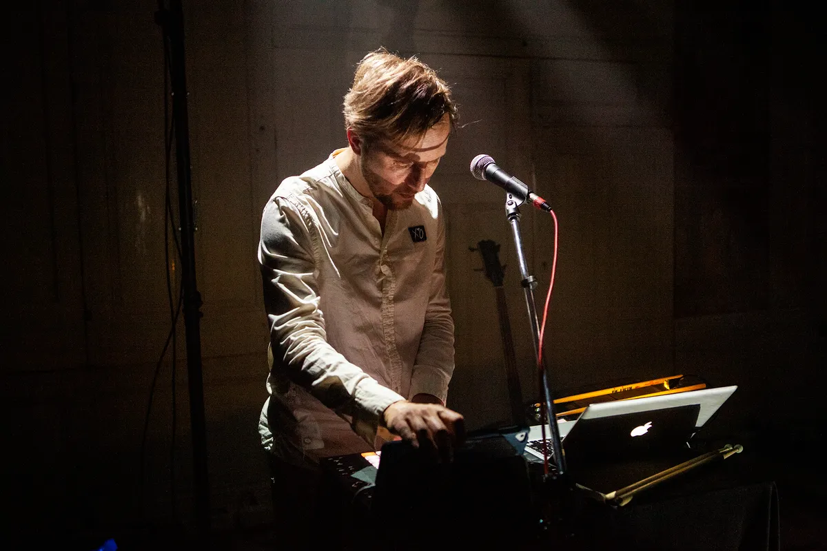 Wat een contrast met de volgende act: voor Out of Skin betreden we een vrijwel verduisterde ruimte. Dit vanwege de lichtshow die Lennert van der Valk speciaal voor de band ontwierp. Met schaarse schijnwerpers en projecties die weerkaatsen in spiegels op de vloer ontstaat een bijzondere sfeer die de ruimtelijke, mysterieuze muziek van Out of Skin onderstreept. De projecties zijn helaas niet vanaf elke zitplaats goed zichtbaar, maar met hun synths en samples, bas- en gitaarklanken en natuurlijk de stem van Wouter weet de band het publiek te betoveren in deze intieme setting. Je zou er haast stil van worden, maar als de groep wordt uitgenodigd tot tweestemmig (!) meezingen doen we dat toch enthousiast.