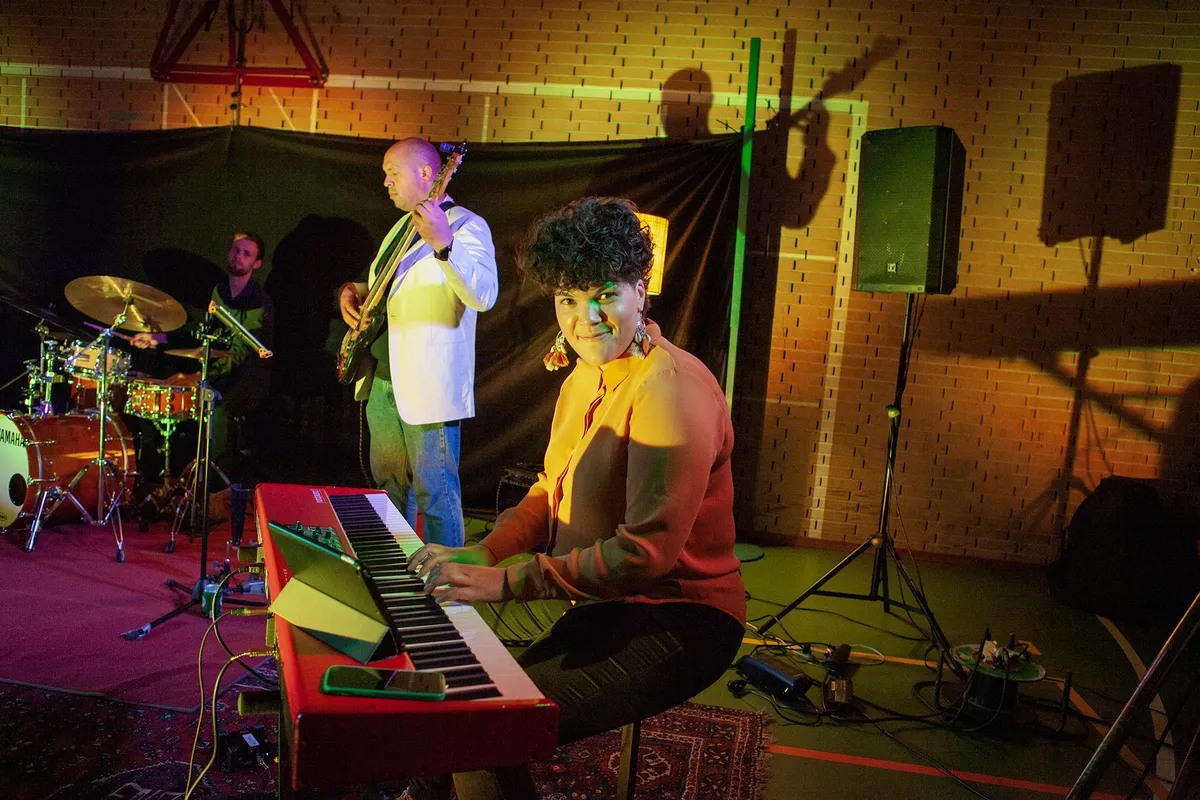 De eerste act die we zien, bestaat echter nog maar kort. The Latin Train laat ons wegzweven naar verre oorden op chille Afro-Cubaanse grooves met fijne basriffs, steady drums, swingende conga’s, aanstekelijke toetsenlicks en een meeslepende dwarsfluit. Gaandeweg wordt hun set meer uptempo en zitten we uitbundig mee te wiegen op de gymzaalbanken. Op deze muziek kun je toch niet stil blijven zitten? Wel zijn we nu meteen lekker los voor de rest van de avond.