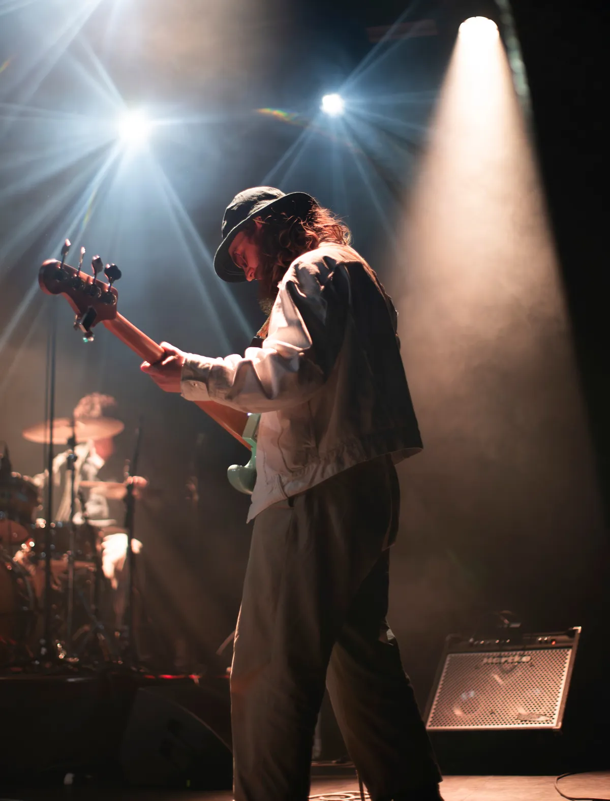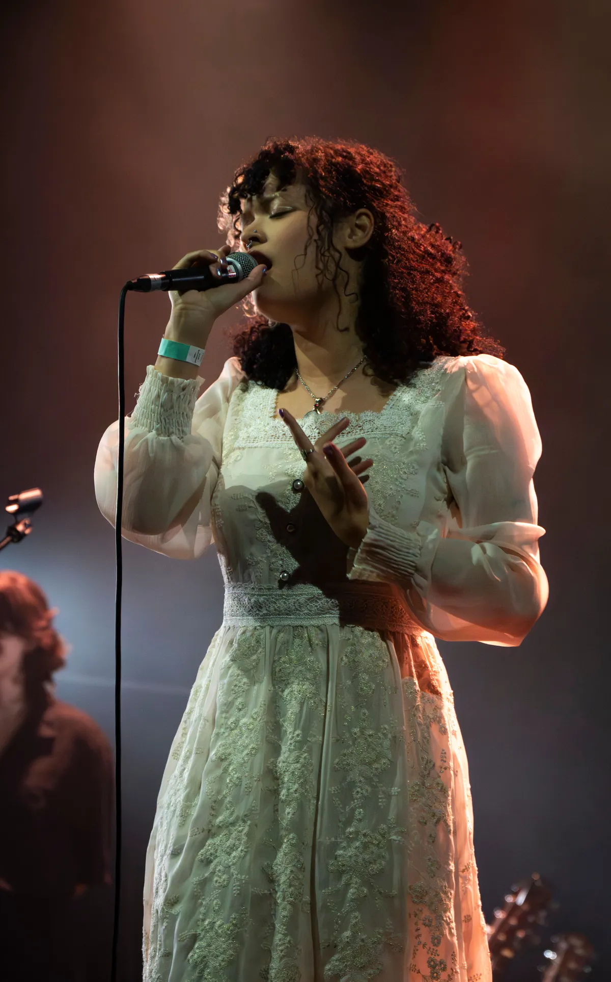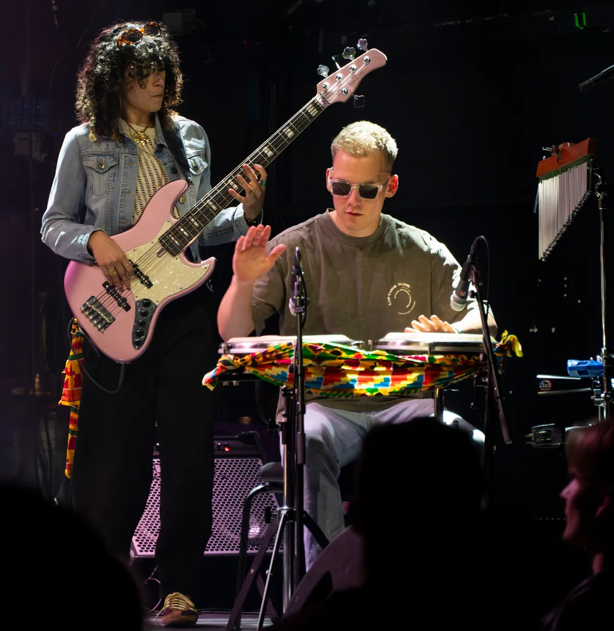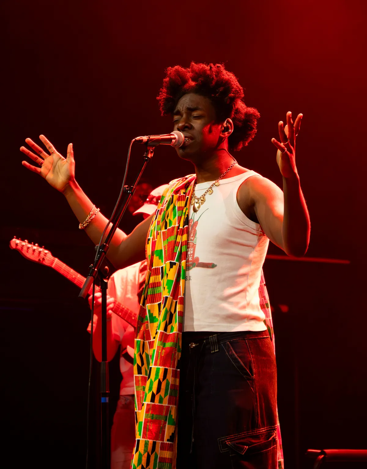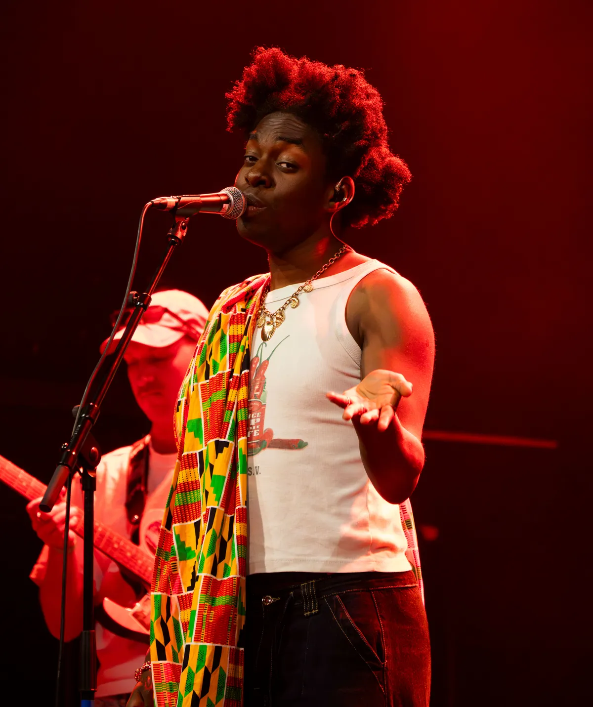 Idrys Kai (Codarts, Rotterdam) trapt, samen met zijn band, de avond af met het energieke Home, hij draagt een Kente, een Ghanese stof die hij sierlijk om zijn schouders en heupen heeft geslagen. Met instrumenten als een bar chime, terre seed shaker en djembe creëert hij samen met zijn band een warme, gelaagde sound. Zijn muziek is een mix van invloeden: van West-Afrikaanse highlife (een genre dat ontstond in Ghana en bekendstaat om zijn dansbare ritmes, gitaren en blazers) tot jazz, R&B en hiphop. Het is pas 19:20 uur en de zaal is nog vrij leeg, maar toch weet Kai direct een groove neer te zetten. Die staat in subtiel contrast met thema’s als mentale gezondheid en zinnen als “the past will always be a part of me”. Hij sluit af met J.U.M.P!, waarin hij de zaal oproept om mee te bewegen. Het publiek geeft daar gehoor aan: we zijn opgewarmd.
