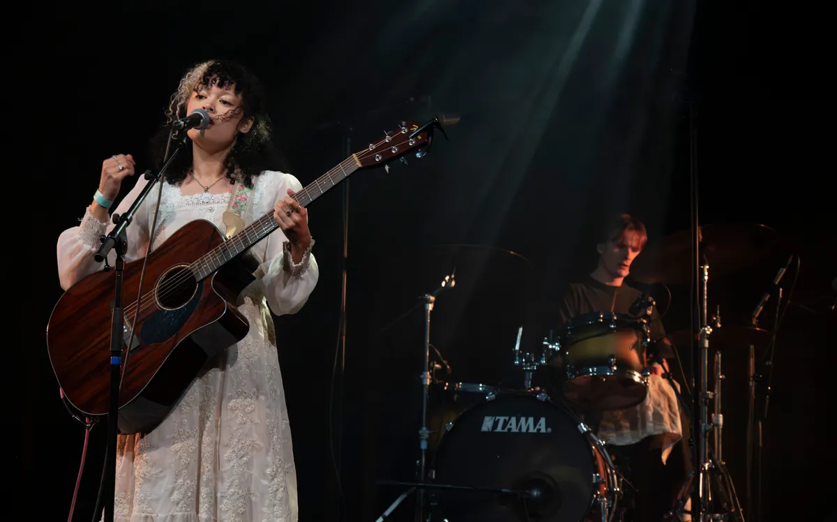 Na een kort intermezzo in de foyer begint het optreden van Rhodon Cerise (Conservatorium Haarlem). Haar zeskoppige band is volledig in het zwart gekleed, terwijl Cerise zelf in een witte jurk in het middelpunt staat, een visueel contrast dat mooi aansluit bij haar muziek. Ze beweegt zich in de hoek van alternatieve folkpop, maar daar doorheen klinken duidelijke invloeden van 90’s rock, aangevuld door haar mooie heldere en hoge stem. Halverwege speelt ze Dark Waters, haar debuutsingle en een ode aan de mensen die haar dierbaar zijn. De band speelt met overtuiging en bouwt de nummers zorgvuldig op: van breekbare, bijna fluisterende passages naar intensere uitbarstingen. In de afsluiter van de set breekt Cerise plots uit met een harde schreeuw, een onverwacht moment dat haar dromerige universum even openbreekt. Juist daardoor blijft het hangen en is dit een van de sterkere sets van de avond.
