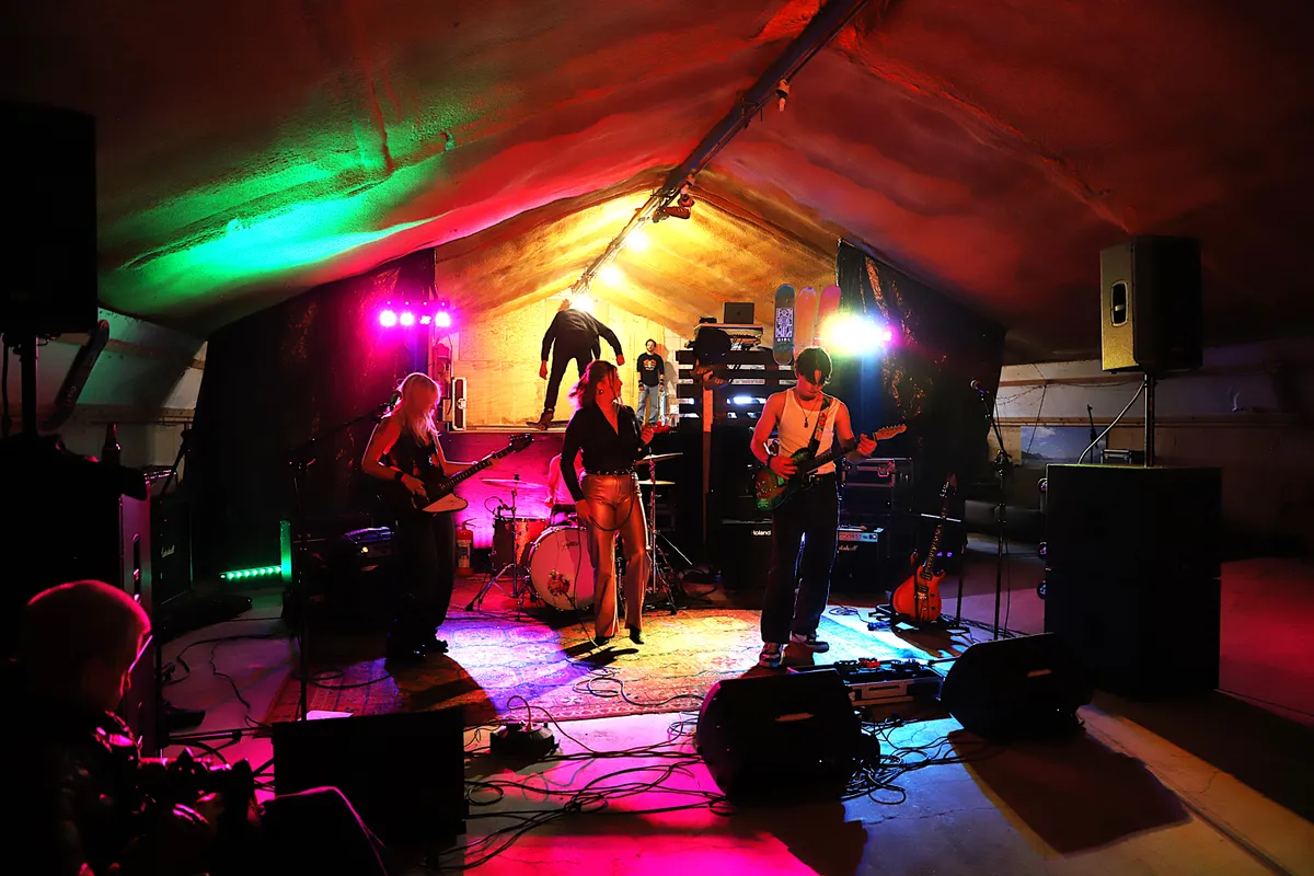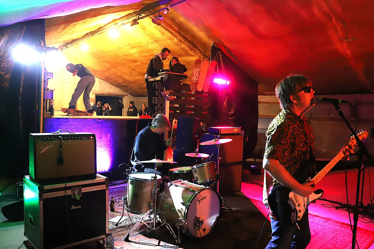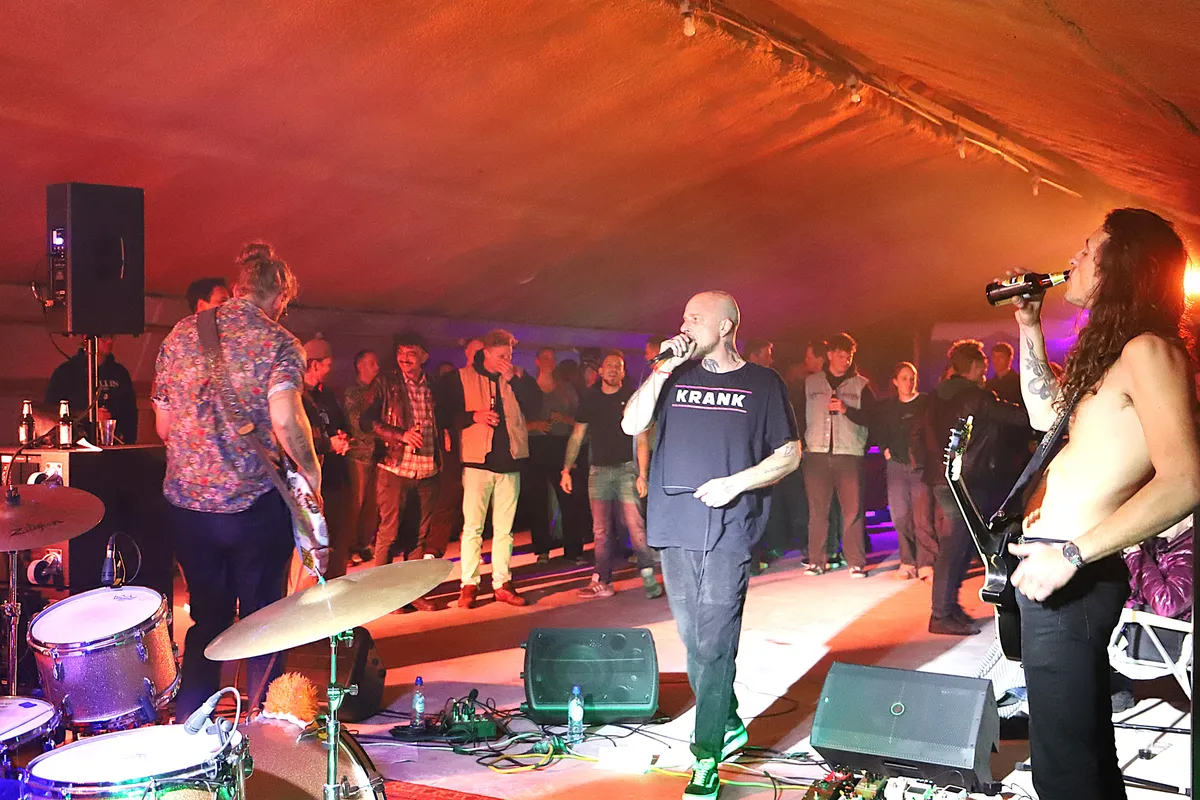 Op het erf staan een paar auto’s, verderop hoor je gitaren, gelach en het geknetter van een vuurton. Voor de lekkere trek zorgt De Fietseria, met dampende pizza’s. Binnen in de schuur trapt M-Braze af, letterlijk met skaters achter zich, want achterin is een heus skatepark gebouwd. “Dit was ons leukste podium ooit,” verzucht bassiste Lara Mul na afloop. Gitarist Sylvano Meijer gooit er scheurende solo’s uit, Marijn de Glopper houdt de vaart erin achter de drums, en het publiek geniet van elke kilometer die de jonge band aflegt.