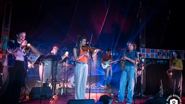Daarna haasten we ons naar de Spiegeltent, waar PARRA.DICE het festival officieel mag aftrappen. Dit negenkoppige collectief, gevormd door vrouwen en non-binaire muzikanten, staat voor de droom van een vrije wereld zonder hokjes, genres of etiketten. Met drie blazers, een viool en een krachtige ritmesectie brengen ze meeslepende melodieën en ritmische patronen waarin uiteenlopende muzikale tradities samensmelten tot een groovende eenheid. Diversiteit als kracht, muzikaal vertaald.
