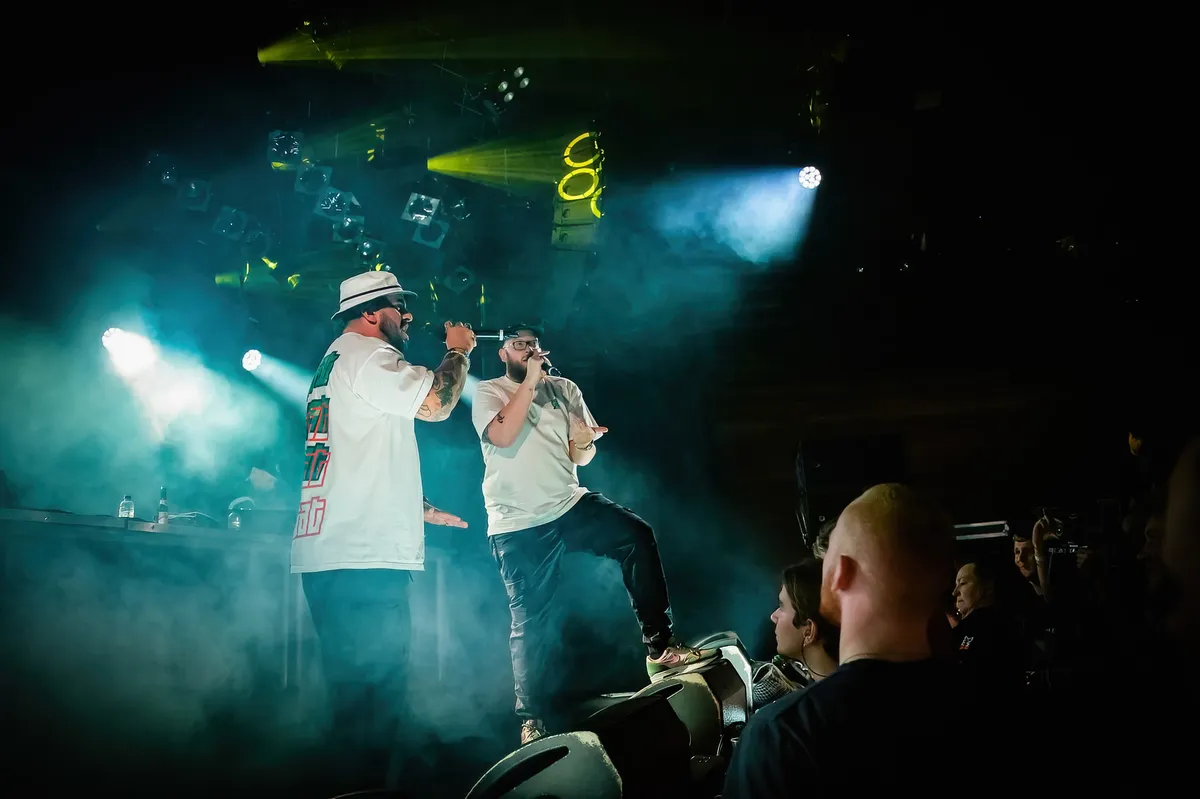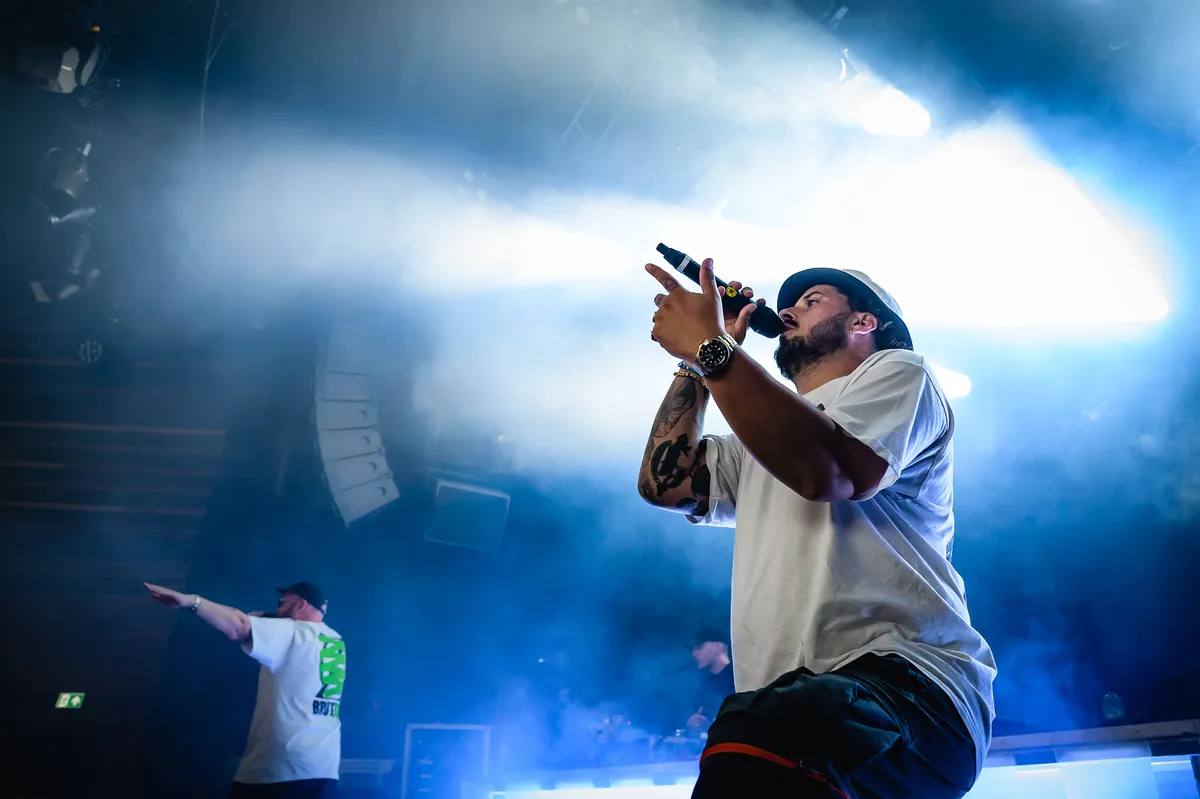 Het is ‘Familie Boven Alles’ bij Stikstof vanavond. Letterlijk want het neefje van een van de mannen mag de moshpit opwarmen. Hij wil pogoën. Voor het zover is, leggen rappers Zwangere Guy en Jazz, bijgestaan door Astrofisiks en dj Vega, de nadruk op serieuzere hiphop. Met name de bekentenissen van Guy en Jazz zijn sterk. Pas ruim over de helft van de set, bij ‘Ambras’ gaat de fik echt in de zaal.