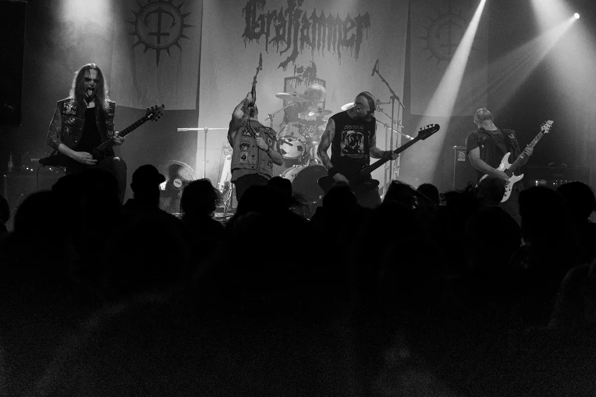 Dan Grafjammer, waarbij het wapen van Utrecht prominent onderdeel is van de opgehangen backdrop achter het podium. Vanaf de eerste seconde kotst de band zijn tracks over het publiek heen, gelijkend aan een overjarig Broodje Mario waarvan de worst inmiddels groenblauw is uitgeslagen en er witte puntjes op de kaas beginnen te vormen die er duidelijk niet horen. Ietsje later begonnen dan gepland, maken ze dat al gelijk goed met een tempo dat volslagen krankzinnige hondsdolheid overschrijdt. Vleugjes rock-'n-roll, thrashmetal, grindcore en punk worden met succes weer in een zwart rokende blender gegooid, met een vleugje zeemansliederen en piraterij. Ook het publiek heeft er zin in vandaag en springt en danst er op los, een heksenketel van jewelste. Onderwijl horen we weer de gebruikelijke, macabere verhalen. Zoals die van ‘Rampokker’ (lees: gewelddadige bandiet), over de vierde gouverneur-generaal van Nederlands-Indië, Jan Pieterszoon Coen, die met harde hand heerste over de kruidenhandel van de VOC. Tracks als ‘Zwarte Hond’ en hun anthem ‘Moord & Doodslag & Jenever’ jakkeren ook voorbij. “Willen jullie wat nieuws horen?“, klinkt het vervolgens als ‘Vuist en Bijl’ erin knalt, van hun nieuwe split EP met Wurgilnô, de zwartgeblakerden uit Limburg die er helaas niet bij konden zijn deze avond. Na nog een paar extra nummers is het weer op met de spijkerharde, verdroogde peperkoek. Nog steeds geldt “Wij zijn Grafjammer en jullie niet!” , daar kunnen we het dan ook weer mee doen.