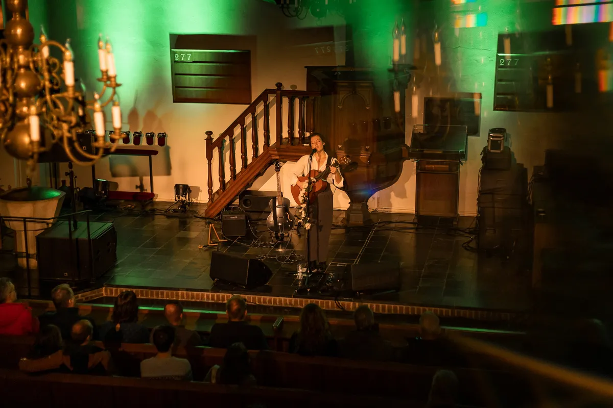 Voor de volgende act moeten we even een ommetje maken. We trotseren de kou en lopen naar de St. Joriskerk. Wie denkt dat deze kerk is opgeknapt tot hip poppodium heeft het mis. We gaan naar binnen via piepende houten deuren en de typische kerkgeur van wierook komt ons tegemoet. We nemen plaats op de houten kerkbank en onderdrukken de neiging om onze handjes in elkaar te vouwen. We zijn hier niet voor een hoogmis, maar wel voor engelenzang: die van Celine Cairo.