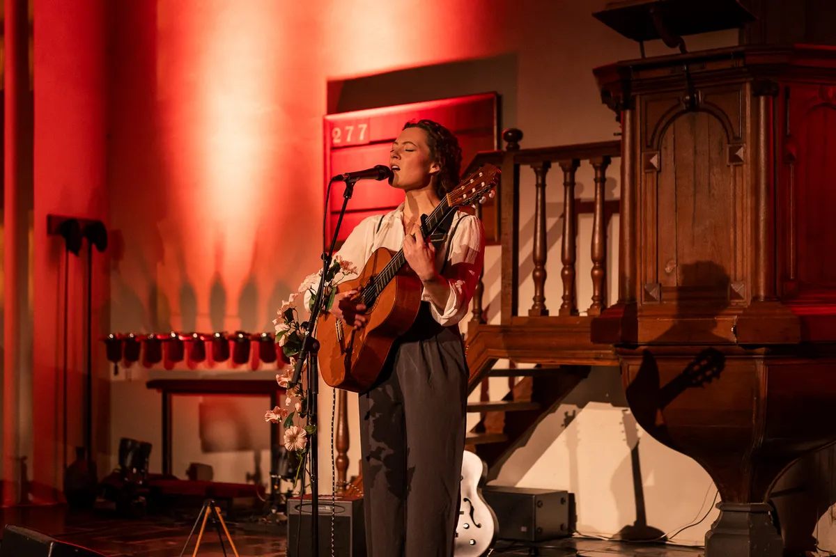Celine Cairo staat hier solo met een akoestische gitaar. Normaal gesproken zou ze een hele band bij zich hebben, maar ze wil graag weten hoe haar nummers het doen in kleinere, intieme settings. Ze is blij dat ze dit prachtige plekje van het festival mag invullen. Je had hier ook geen betere artiest neer kunnen zetten. De akoestiek in de kerk zorgt voor een lichte galm en geeft de dromerige sound van Celine nog wat extra’s mee. Haar optreden is heel persoonlijk; bij enkele nummers geeft ze een toelichting over de inspiratiebron. Ze vertelt dat ze op het conservatorium zat, maar heel sterk wist dat ze eigenlijk haar eigen weg moest volgen. Ze stopte met de opleiding en tegelijkertijd eindigde haar relatie. In het najaar gingen haar vrienden terug naar het conservatorium en zij zat thuis. Ze wist even niet hoe ze die periode moest overbruggen en wilde de winter het liefst skippen. In die tijd schreef ze het prachtige 'Hibernate'. Niet alleen dit, maar eigenlijk al haar nummers komen ontzettend goed uit de verf. Het is de eerste keer dat we een kerk met tegenzin verlaten.