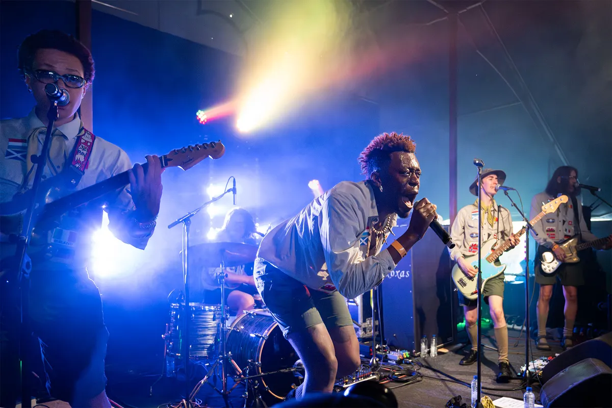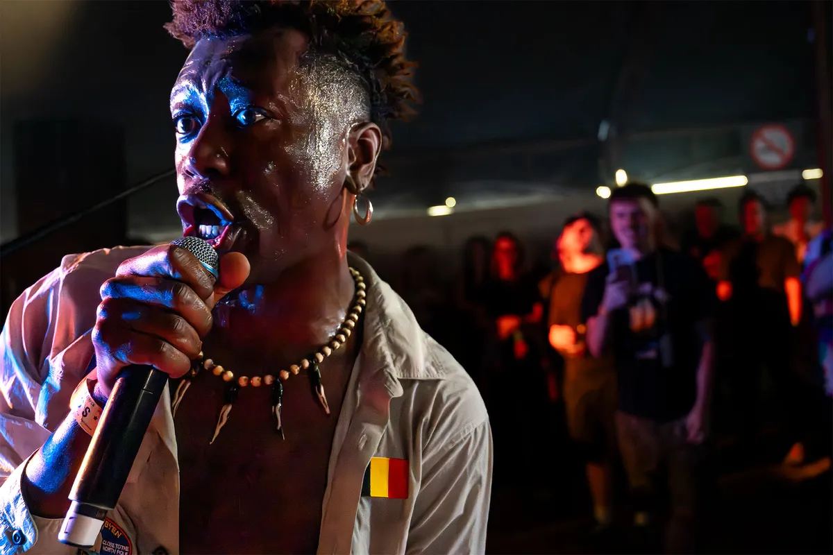Deadletter, afkomstig uit de grimmige krochten van Yorkshire, maar getekend door hun verblijf in Zuid-Londen, bouwen hun set op als een confrontatie. Muzikaal is het strak, cleaner dan je zou verwachten van een band die klinkt alsof ze hun repetities houden in de schuur van de buurman. De baslijnen zijn vettig en dominant, de sax giert als een sirene door de nummers heen. Het publiek, een mix van nieuwsgierige Zeeuwen en doorgewinterde postpunk-pelgrims, gaat er verrassend gretig in mee. Zelfs de nieuwsgierige festivalgangers die aanvankelijk blijven hangen uit “eens kijken wat dit is dan” luisteren de set tot het einde af.