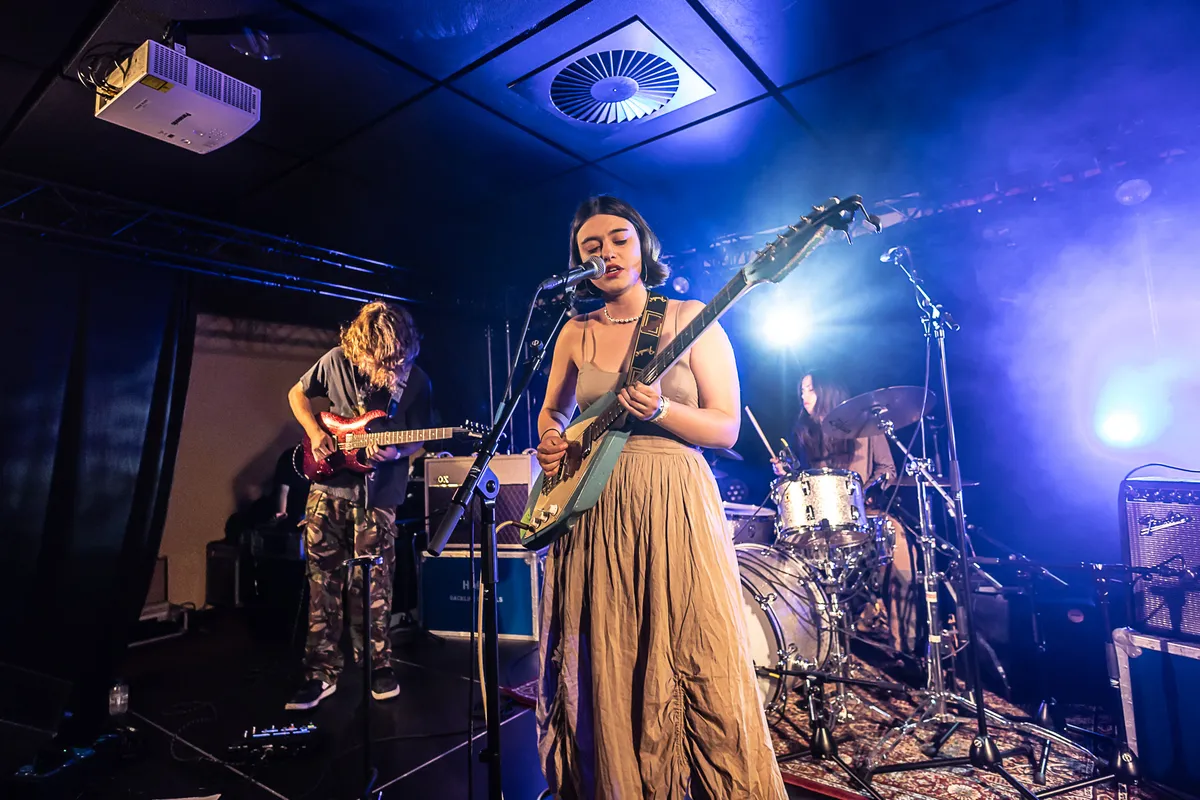 Met haar Dr. Martens schoenen, lange jurk, grote oorbellen, korte bob en een verweerde zeshoekige gitaar om haar nek is Kynsy, alias Ciara Lindsey, een stoere verschijning. Ze wordt vandaag ondersteund door haar nieuwe band, met wie ze nog maar een paar gigs heeft gespeeld. Het is een vreemd gezicht, die nog niet op elkaar ingespeelde band achter een vrouw die zo stevig in haar schoenen staat. Vooral de gitarist valt op, die de hele tijd met zijn ogen dicht en zijn mond open staat te spelen, alsof hij op een andere planeet is.