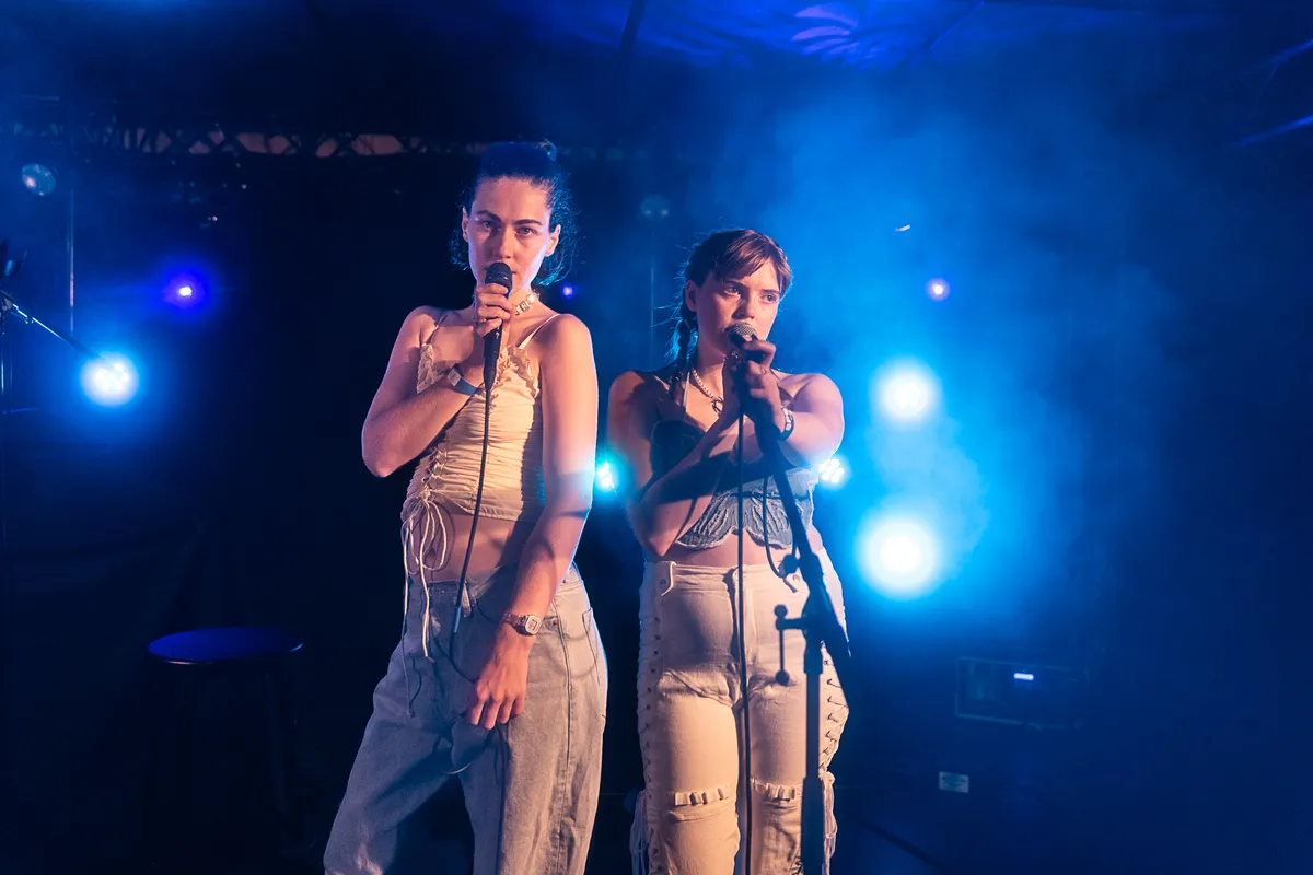 Now for something completely different. Op het podium van de Pandora gaan twee vrouwen naast elkaar op barkrukken zitten, terwijl er een synthbeat wordt afgespeeld. Synchroon slaan ze één been over het andere, zetten ze hun voeten weer naast elkaar en slaan vervolgens het andere been over hun dijen. Intussen staren ze met hun helderblauwe ogen recht in je ziel, zonder ook maar één moment te glimlachen. ‘Ultraflex’ zeggen ze een paar keer op de beat. Dan staan ze op, één van hen likt het klokkenspel dat op het podium staat, met dromerig geklingel tot gevolg. Voor de kijker links op het podium staat een laptop waarop aerobics beelden worden getoond.