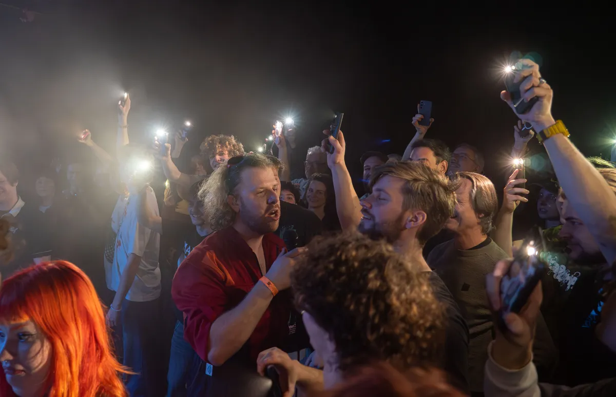 Meeknikken doet TAXITAXI ook vanuit het publiek, nog onopvallend zonder hun iconische motorsporttenues. Anderhalf jaar nadat ze tijdens Popronde Den Bosch Café de Palm op stelten hadden gezet, mogen chauffeurs Roberto Cornetto, Bobbie Baloney en Freddie Sunshine wederom laten zien wat zo goed werkt aan dit trio: korte, puntige punkrock-songs met Nederlandstalige teksten die je na één refrein al meteen kan meezingen als je het nog niet kent. De Groningers hoeven daar niet bang voor te zijn: W2 staat vol met een relatief jong publiek dat hits als ‘Teamleider’, ‘Mensen Praten’ en ‘Vliegtuig’ uit volle borst meezingt, zeker bij dat laatste als Roberto volgens goed gebruik er een episch moment van maakt door de zaal in te duiken om te zingen. Stress als even later zijn drumpedaal het begeeft en een matig stukje publieksparticipatie wordt gered door het pedaal van Jan van Dirty Vistas. De eerst nog voorzichtige pit is dan écht geopend, het nieuwe ‘Mens Of Machine’ is een dancerock-kraker in de dop en op ‘Vissenkom’ wordt het kolkende W2 een kakafonie van rondvliegend bier, ledematen en zweet.