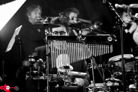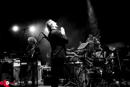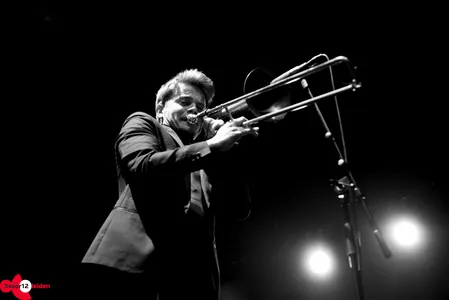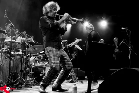 Delfos kondigt Eric Vloeimans, "de grootheid", aan op een bed van geblazen akkoorden. De trompettist zijn rode ruitjesbroek contrasteert fantastisch met de kleding van de band achter hem. Gezamenlijk zetten ze de set voort met 'Monseigneur Aznavour', een ode aan de chansonnier Aznavour, met een omlijsting van schelpen in de percussie en Vloeimans' trompet, liever en zachter dan je ooit kon dromen. De trompetmicrofoon is echter gekoppeld aan allerlei pedalen, waarmee Vloeimans per wending in het stuk een nieuw effect creëert. Zo zit er zelfs een bijna ska-achtig deel in, waarin de trompet samen soleert met de tenorsaxen. Het lieve karakter is compleet verdwenen wanneer het drumstel een fors pak slaag krijgt van Leidse bekende Sven Rozier en we op ruiger vaarwater geraken. Zowel band als solist weet zich perfect door alle genres heen te manoeuvreren.
