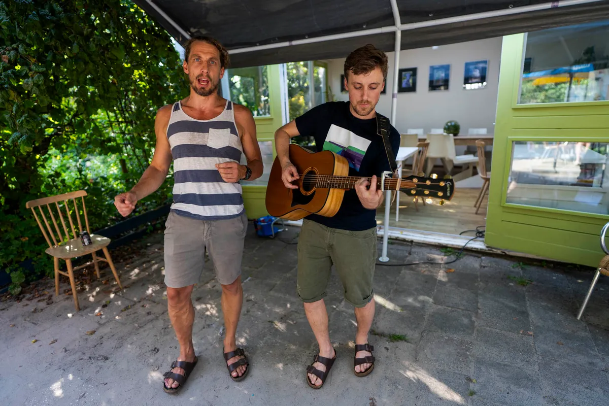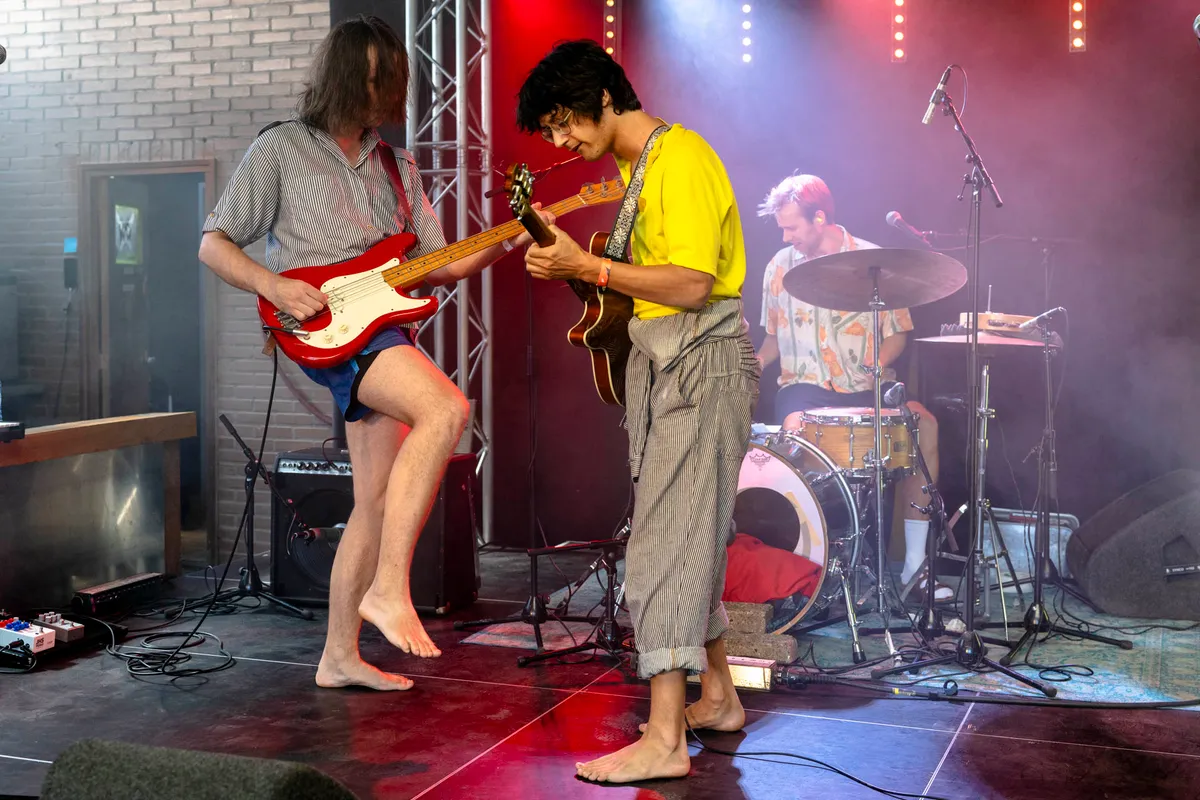 Op het zonovergoten terrein tikt het kwik maar liefst 29 graden aan en dat is meteen te merken op het podium van café de Helling, waar het door de Kunstbende geprogrammeerde The Belastingdienst het startschot geeft. De band staat collectief in korte broek op het podium, een trend die zich de rest van de dag voortzet.