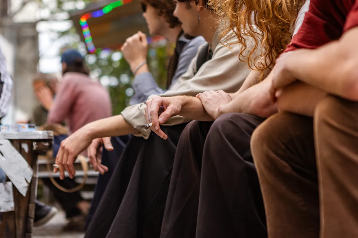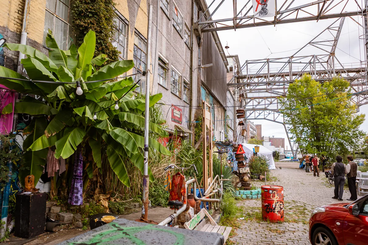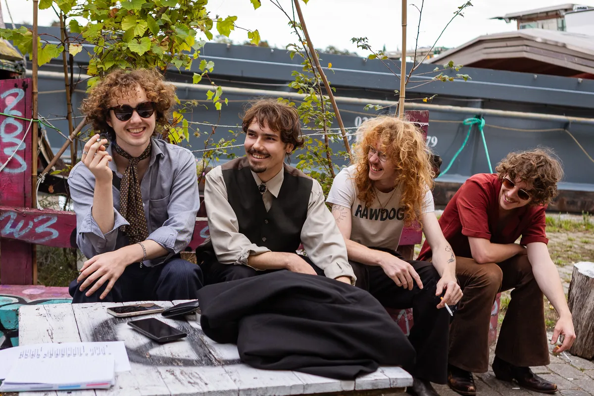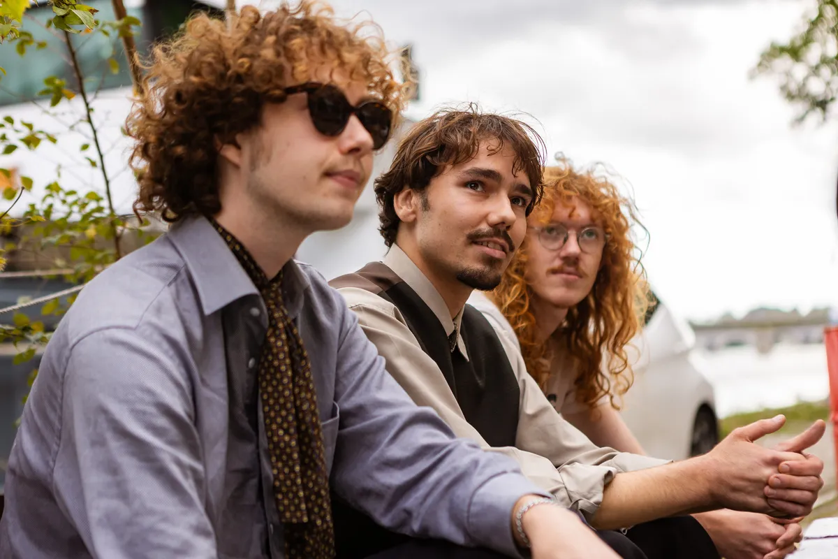 We hebben om 17 uur afgesproken met frontman Jordy bij het Landbouwbelang. Vooraf vroegen we ons al af of dit wel een handig moment zou zijn, aangezien de deuren om 18 uur opengaan en de eerste band om 18.30 uur aftrapt. We zijn dan ook niet verbaasd dat het allemaal een tikkeltje chaotisch oogt. Maar dat past eigenlijk ook perfect bij de underground vibe die het LBB al heeft. Het duurt even voordat de band compleet is - zonnebrillen moeten worden opgezet, peuken worden aangestoken - maar dan kunnen we beginnen aan de oever langs de Maas.