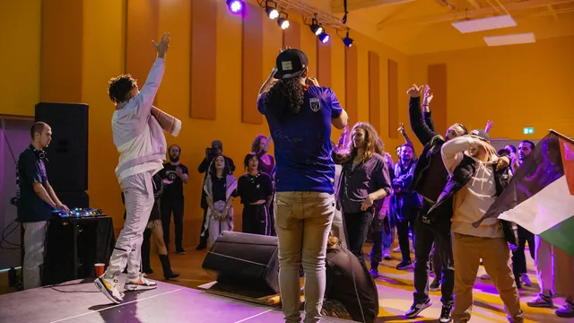 Na het koekeloeren wordt het tijd om zelf te dansen met een set aan clubmixes van 90’s en noughties MENA-hits onder leiding van Disco Arabesque. Het moet vermeldt worden dat dit een volledige droge toko is, maar dat ook zonder drank iedereen vanaf het eerste nummer enthousiast danst op tracks die variëren van borderline psychedelisch tot recht voor z’n raap bangers. Er gaat zelfs een heuse sliert dabke dansers door de zaal heen. Na het vertier volgt een korte mededeling van een spreker van BDS (Boycot, Divestment & Sanctions) over hoe breed de boycotcampagne tegen Israël getrokken moet worden. Het Hiphophuis zelf wordt als voorbeeld genoemd als een zogeheten apartheidvrije zone, waar op geen enkele wijze economische banden met het land worden aangegaan (lees: geen producten of podium aanbieden).