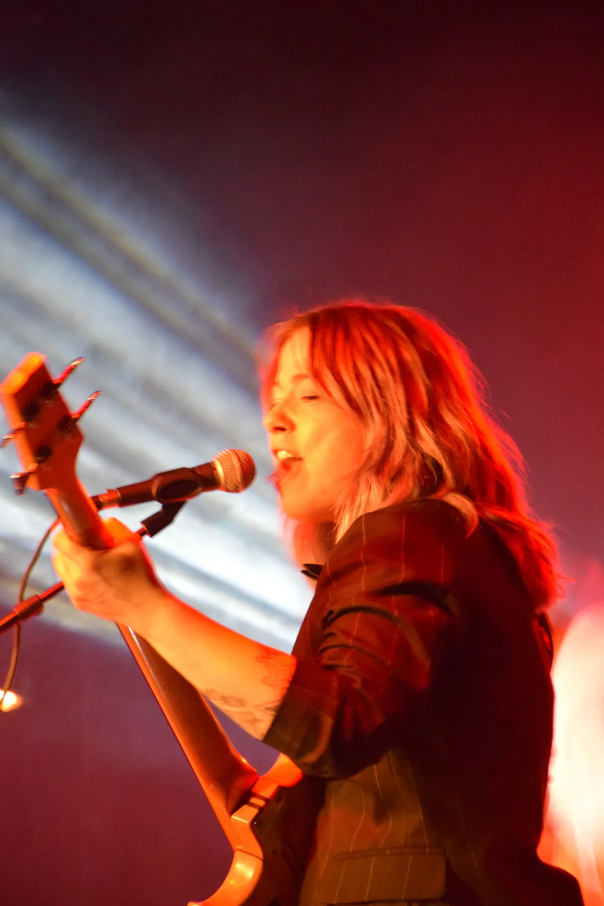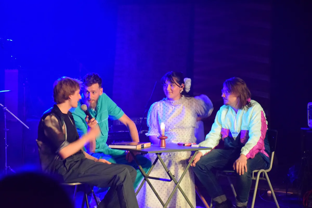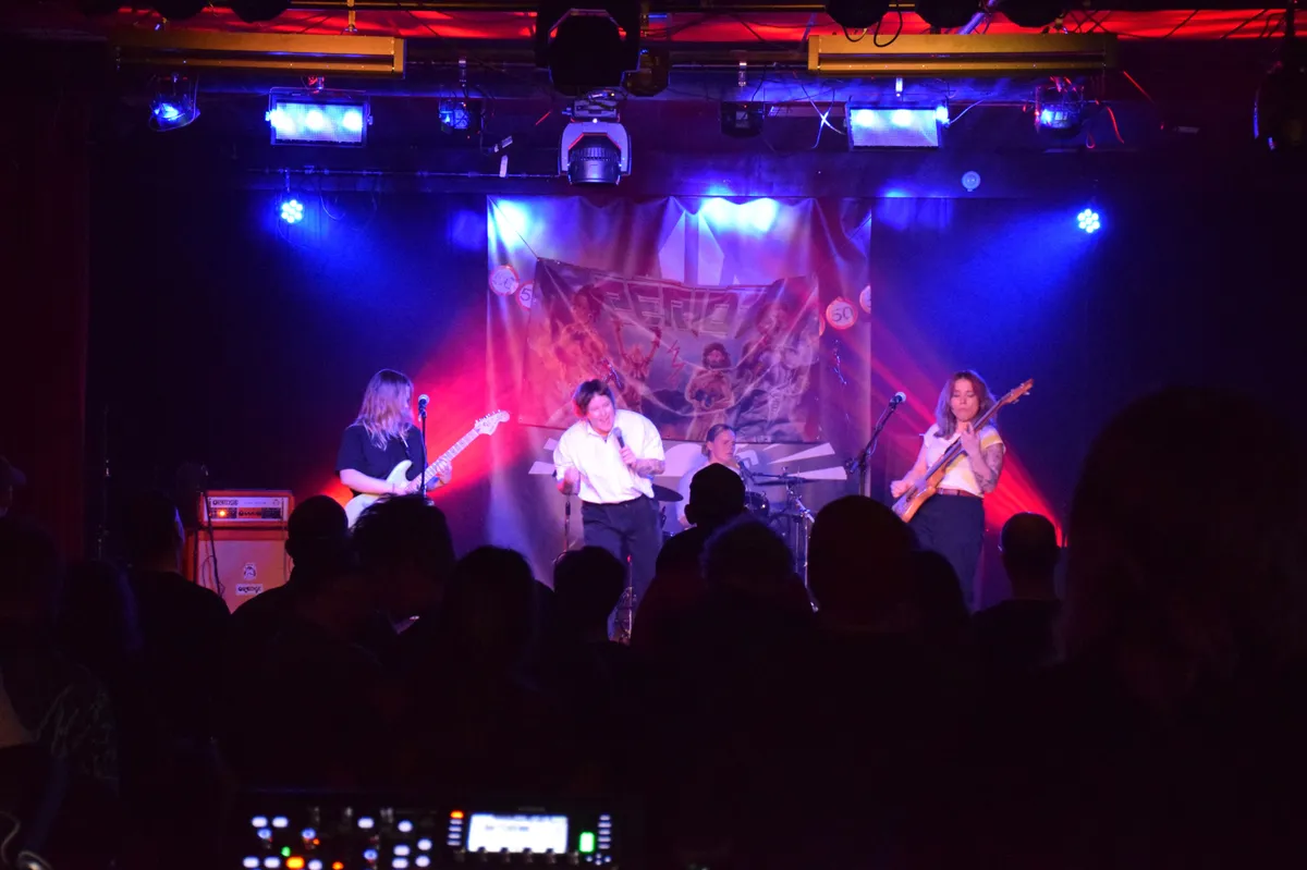 De grote zaal is goed gevuld voor een andere publiekstrekker van de avond, Femme Fugazi, een post-punkband uit Nijmegen (en oud-deelnemer aan Popronde 2023) die flink aan de weg timmert. Voorafgaand aan hun optreden is er een kort interviewtje met de hosts - leden van de Arnhemse indie-rockband The Shutz. Na een onheilspellend muzikaal intro gaat het vervolgens los. De nummers zitten goed in elkaar, elk heeft zijn/haar geavanceerde partijen en de podiumprésence is overtuigend. Het is wel jammer dat het geluid niet helemaal de zaal in lijkt te komen als gepland. Vocalist Chris heeft een geweldige controle over haar stem (ze is tevens zangdocent op De Berg), maar ze lijkt -- door een technisch ongelukkige afstelling wellicht -- niet makkelijk boven de rest van de band uit te komen. Met of zonder oordoppen, de vocals komen er niet bovenuit.