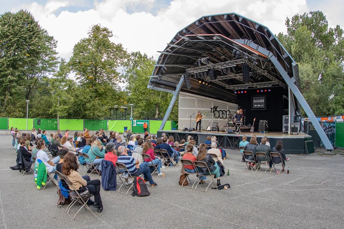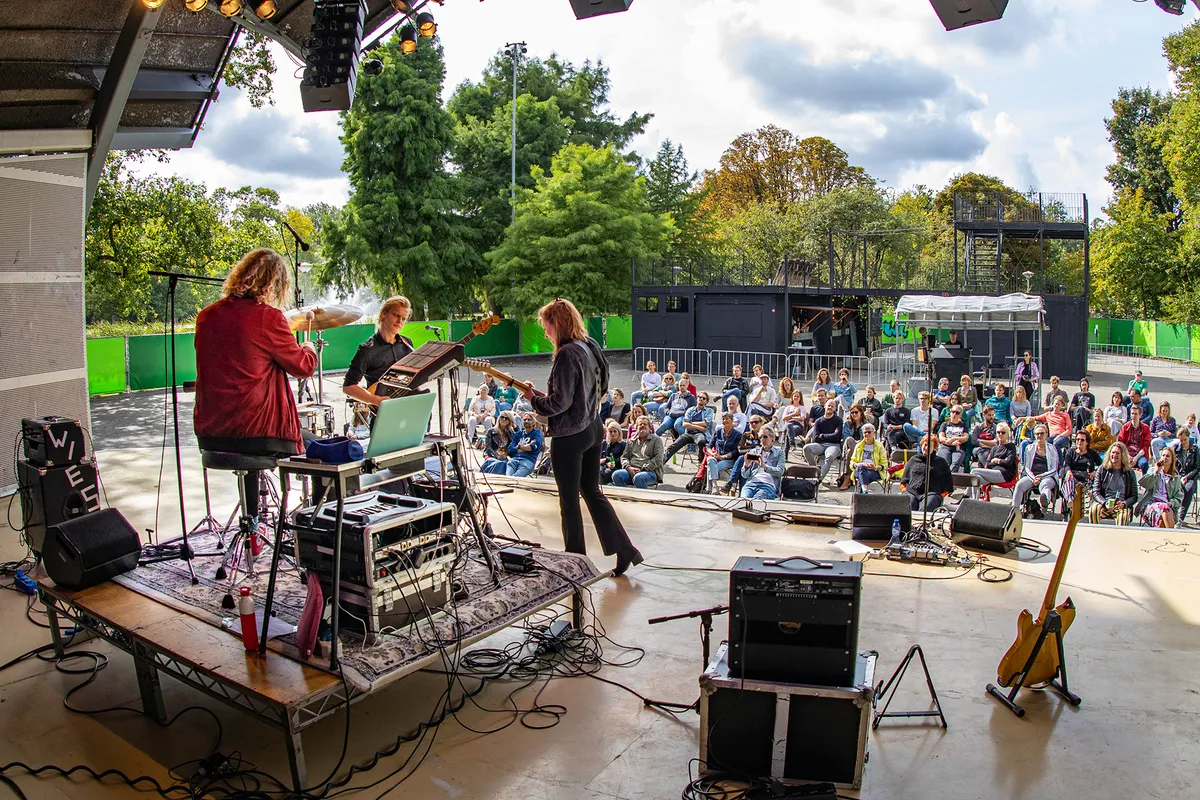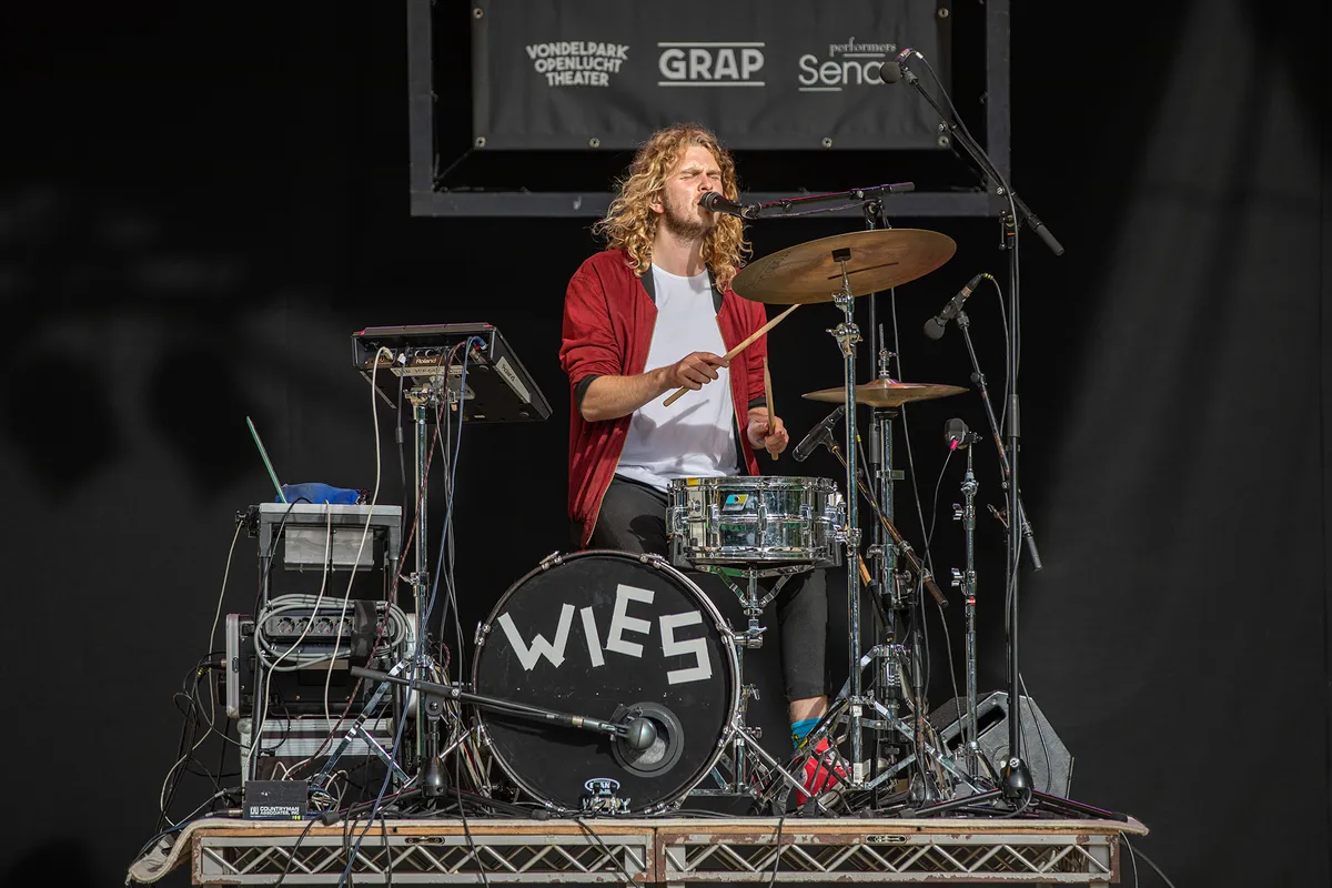 Het is even wennen om het grote terrein van het openluchttheater in het Amsterdamse Vondelpark zonder volle tribunes te zien. Dit jaar is alles anders door de Corona-maatregelen en moeten er ook van te voren plaatsen gereserveerd worden en kunnen bezoekers niet meer op de bonnefooi langskomen. Het is dan ook niet gek dat door de beperkte capaciteit alle plekken bezet zijn vanmiddag als WIES op het programma staat. De band is met de hitsingles ‘Soms is het te laat’ en ‘Radiostilte’ veelvuldig op de radio te horen en tijdens Noorderslag dit jaar ontvingen ze de 3FM Talent Award 2020. Door het wegvallen van de festivalzomer en uitgestelde optredens speelde de band diverse livestreams voor een klein publiek. Vanmiddag staat WIES voor het eerst weer voor een groter publiek in de buitenlucht dat toch een beetje doet denken aan een optreden op een festival. Met het nazomerse weer belooft het deze zaterdag een mooie middag te worden.