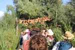 ,,In 2022 bestond Ruigoord 50 jaar. Dat voorjaar dachten we: laten we het anders aanpakken. Van maart tot juli hadden we met de container de eerste start. Alles wat je nu vol braam ziet, was vroeger vaste grond. Alles van riet was moeras. Alleen deze prachtige wilg stond er al,” vertelt Jonathan tijdens een rondleiding in pure Freek Vonk-modus. ,,Ach, wat heeft dit paaltje een hoop meegemaakt,” zegt hij terwijl we afdalen van de boomhut naar een bruggetje, en tegen een versierde variatie van het Amsterdammetje aanlopen. Een paaldansplaatje, een mijlpaaltje? ,,Haha, nou, het is zeker een vorm van erkenning. Dit stuk hout heeft al zoveel mooie plekken meegemaakt.”