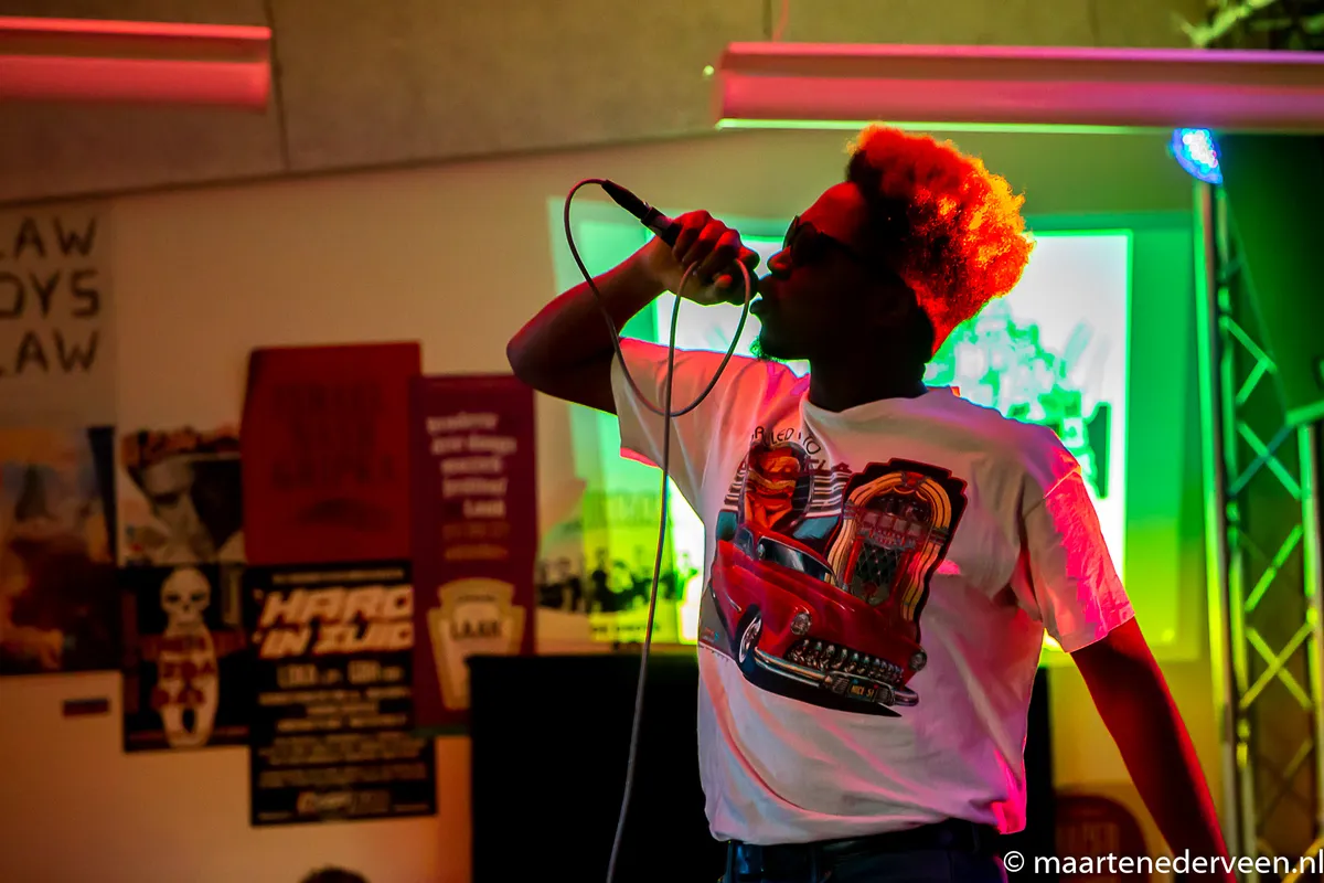 23:00 Wieoee Wieooe, het brandalarm gaat af terwijl wij ons rond de 54-stage bevinden. Even is iedereen in paniek, moeten we alles afblazen? Is het gedaan? Nee, gelukkig mogen we door. Een enkele medewerker horen we mompelen dat er: “vast geblowt wordt bij die rappers in de zaal.” Terwijl er duidelijk mensen in de deuropening van het pand, en dus niet in de buurt van Ruimte 15, hun sigaret aansteken voordat ze deze buiten oproken. OK BOOMER.