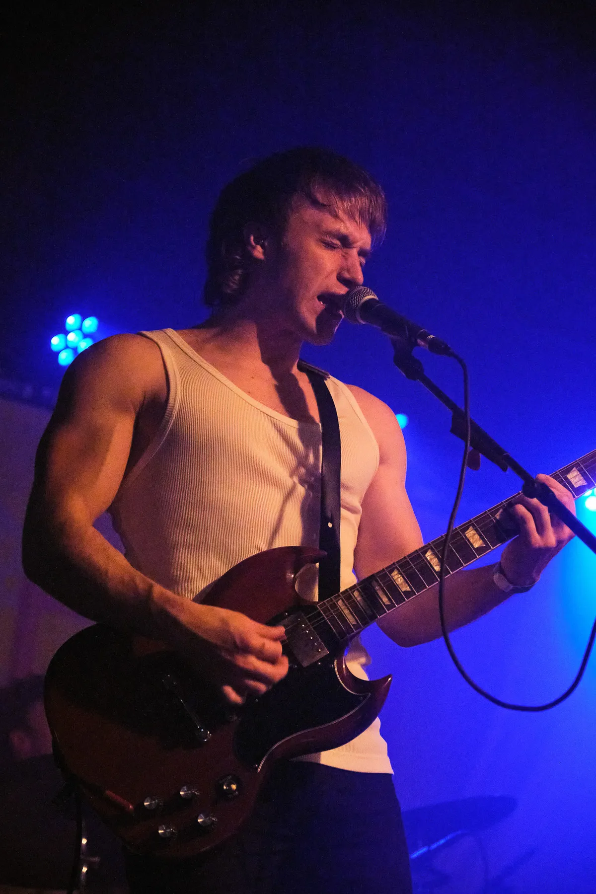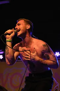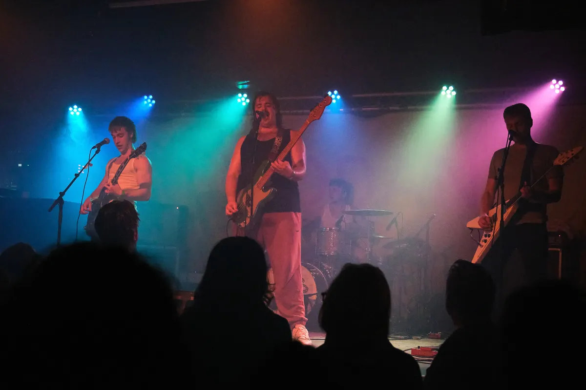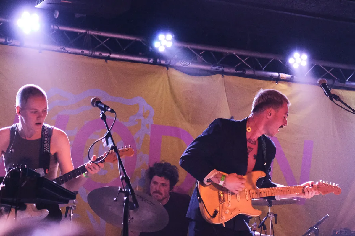 Er is enige verwarring bij het publiek te bespeuren wanneer het nummer ‘Wat voor weer zou het zijn in Den Haag’ van Conny Stuart door de speakers galmt. Hoe het weer in Den Haag is weten we niet, maar wanneer de Wodan Boys al zingend het podium betreedt, is één ding zeker: vanavond stormt het in Eindhoven. De eerste kreet is eruit voordat we er erg in hebben. “Eindhovûh!!”, brult gitarist Mikkie B Wessels in de microfoon. “Eindhoven helemaal gek”. ‘Helemaal gek’ is vanavond het Haagse equivalent van ‘Eindhoven de gekste’. De eerste woorden zijn een voorbode van wat er op ons te wachten staat: vijftig minuten gek doen dus. Maar aanvankelijk lijkt de energie en gekheid alleen van het podium af te komen. Om meer pit uit het publiek te krijgen, wordt er nog een aantal keren “Eindhovûh” geroepen, waarop er vanuit de zaal grappend geantwoord wordt: “Spelûh”. En dat doen ze. Met ongekende energie en beukende drums zetten ze bij elk nummer nog een tandje bij. Vurig worden de gitaren ingezet, waarbij er zelfs een aantal snaren sneuvelen. Naarmate de set vordert, neemt de opwinding toe en kijk daar, bij het vijfde nummer begint zich de eerste moshpit te vormen en is de zaal uiteindelijk niet meer te houden. Daarbij vliegen er ook nog wat merch-sjaals vanaf het podium om onze oren, die het publiek gretig in ontvangst neemt.