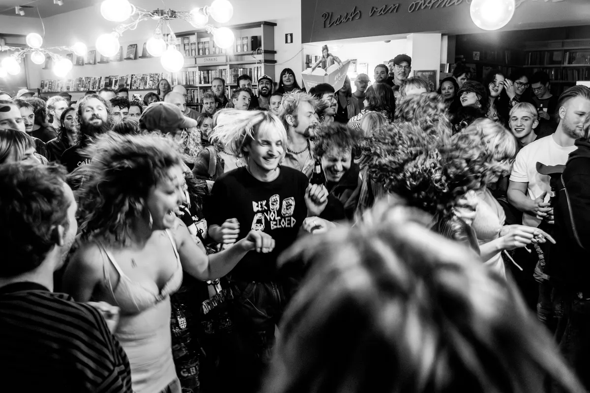 “Luid, dansbaar en pure waanzin”, schrijft de organisatie van de Popronde. “Post kraut pop disco punk”, noemt de band het zelf. “Dat willen we niet missen”, aldus ondergetekende, en daarom rijden we weer snel terug naar de luidruchtigste boekwinkel van het land (vanavond althans). De Tilburgers van Fellatio hebben uitstekend geluisterd naar de muziek van Snapped Ankles en Fat Dog. Ze weten met ritmische elektronica, herkenbare samples en overstuurde synths een waanzinnig sound neer te zetten. Het is gek, het is dansbaar, en het is vooral één bonk energie. De boekwinkel is even veranderd in een kolkende mensenmassa. Daarom ook het vriendelijke verzoek aan de band om snel meer muziek uit te brengen.