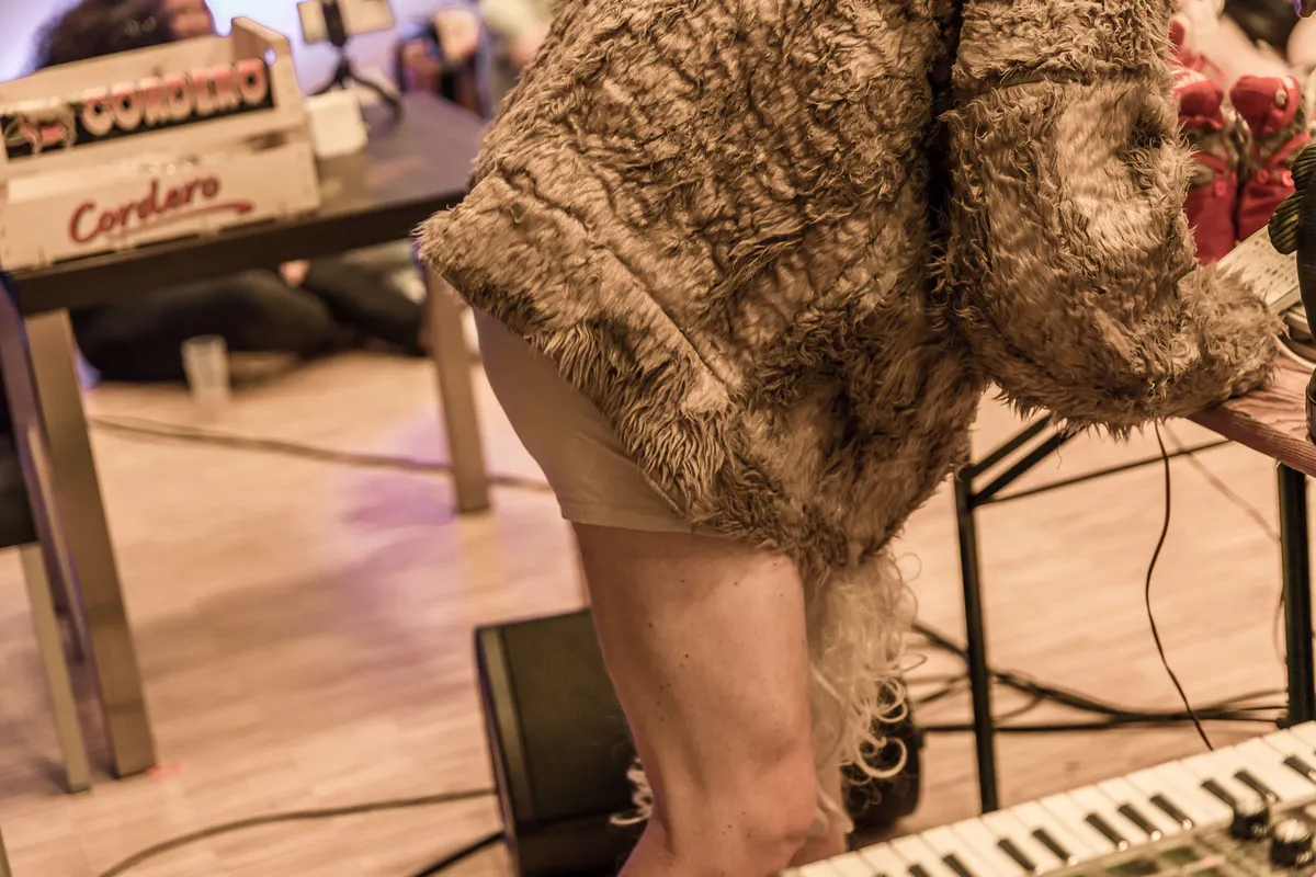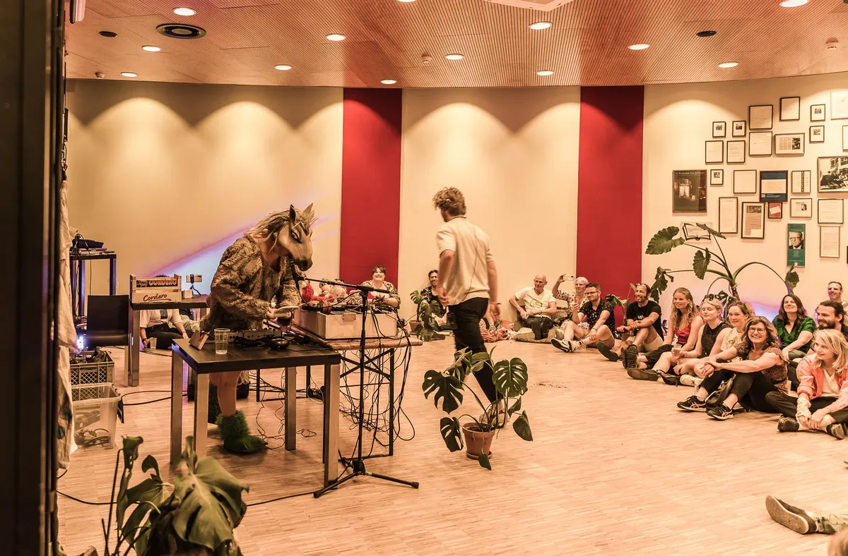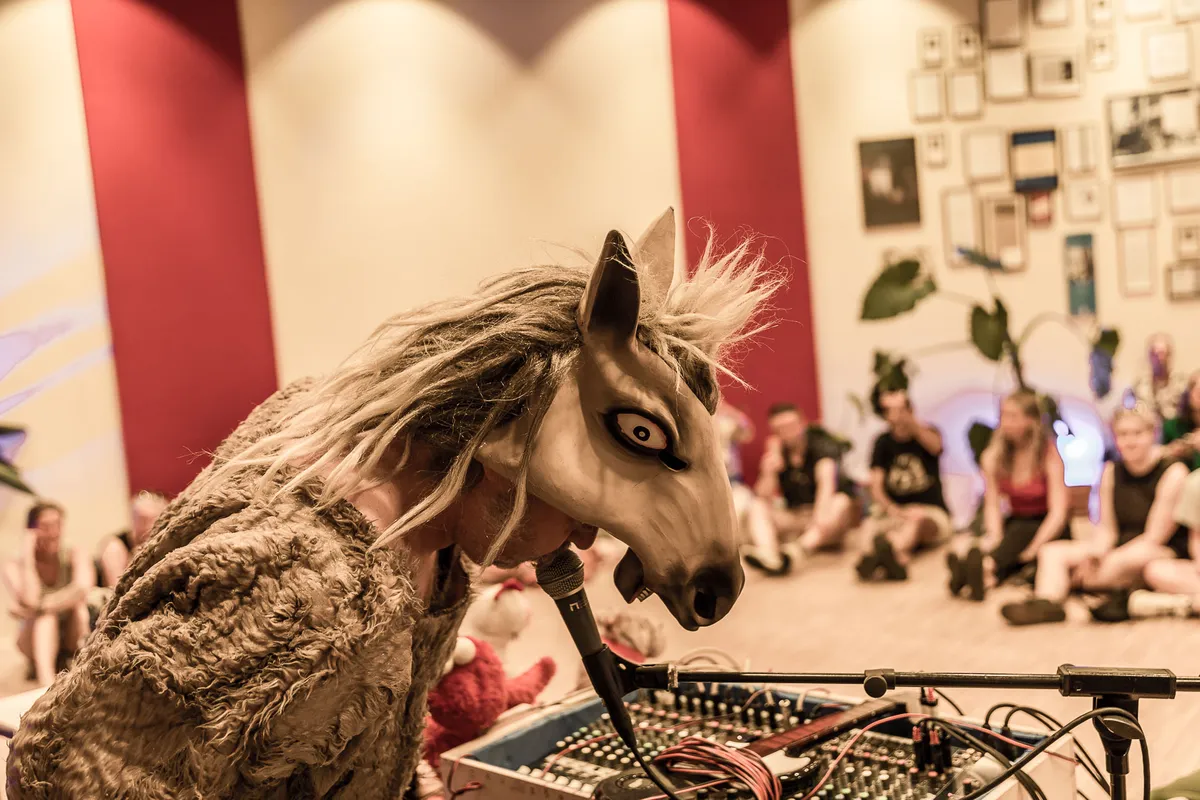 Gehuld in een paardenmasker, een soort schapenvacht en kikkersloffen, is het meteen al duidelijk dat een optreden van Joe Kisser in elk geval memorabel gaat zijn. Traditionele instrumenten worden hier geschuwd en in plaats daarvan heeft Joe een klein legertje bewegende speelgoedpoppen die stuk voor stuk een eigen nummer kunnen voordragen. Van een zingende vis die de kunsten van Gloria Gaynor imiteert tot Elmo die doorlopend “Come closer, I love you” schreeuwt, is er vrijwel geen genre dat niet langskomt in zijn eigenzinnige werken met even eigenzinnige namen als Goudvis oud en nieuw. Het is een biologerende show waarin enthousiasme, vrees en schaamte zich op fascinerende wijze met elkaar vermengen als hij uiteindelijk zijn paardenkostuum uittrekt en in slechts zijn onderbroek op zijn rug door het publiek heen glijdt. Het is even vermakelijk als ongemakkelijk, maar in elk geval volledig onnavolgbaar. (WN)