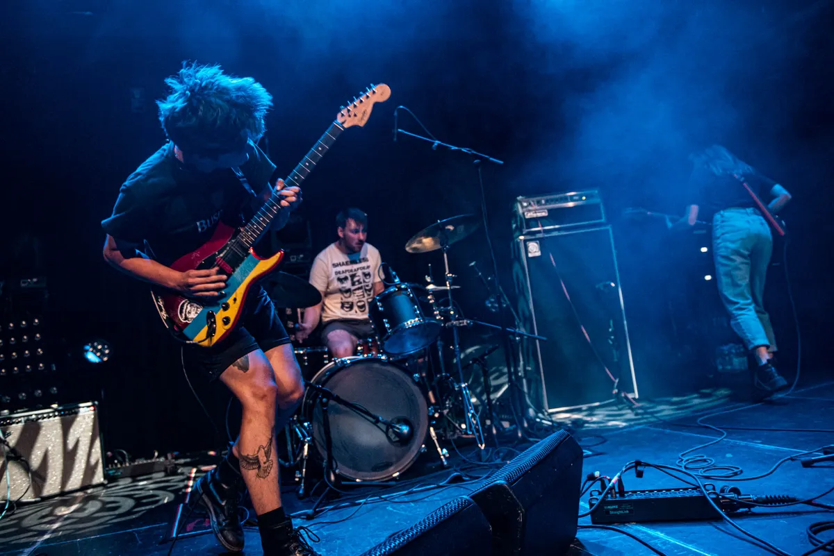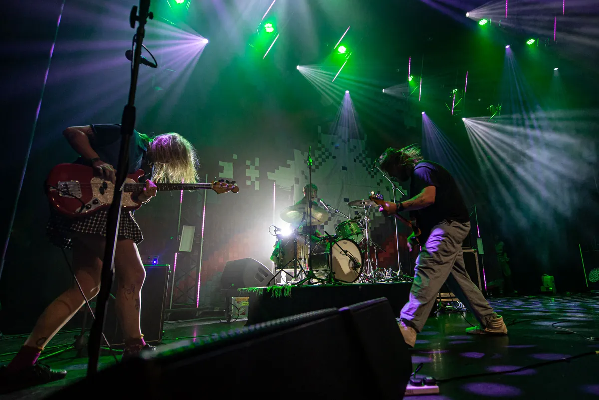 De cybernetisch ogende, post-punkende drie dames van het Londense Deep Tan laten Boksum met een goed shot weirdness soms vol verbazing verrassen, met hun knap excentrieke songs. Die stuiteren, doorvlochten met kekke, tegendraadse loopjes en ingenieus geplaatste maatwisselingen, onstuimig en panisch door de volgepakte zaal. Het doet daarin ietwat mathcore aan, en wat die gekte betreft komt zelfs een beetje Primus bovendrijven. Dat laatste ook zeker ingegeven door bepaalde basmotiefjes. Verder doet die wijze van zingen van de Franse vocaliste/gitariste Wafah Latour denken aan Siouxsie and the Banshees, maar dan obstinater. En, gezien haar taalachtergrond komt er ook Franstalige lyriek langs. Het continue gebruik van het hoog afgestelde treble-effect op de gitaar begint binnen Deep Tans songhectiek op den duur een lichte beproeving te worden. Het drukt daarentegen zeker niet de pret. Lekker recalcitrant bandje, dit Deep Tan. (JdR)
