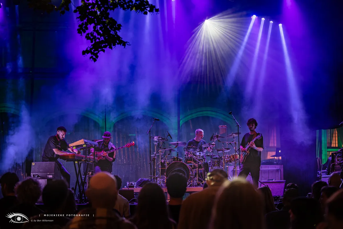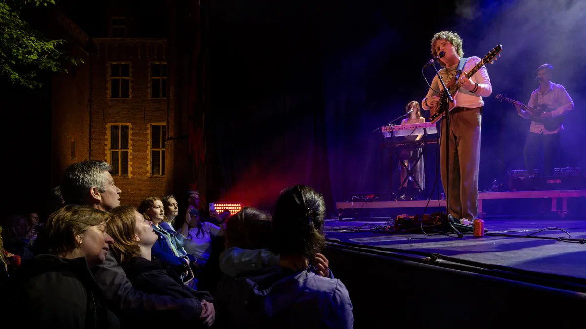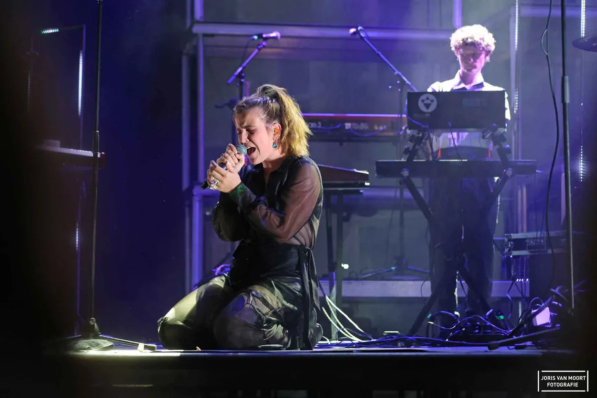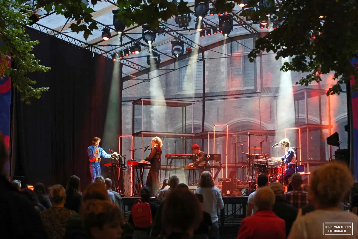Zodra het podium omgebouwd wordt, komen er trouwe fans vooraan staan: de Vlaamse band Portland, genoemd naar de woonplaats van idool Elliott Smith, heeft ontroerend trouwe fans. Met een nieuwe zangeres/toetseniste, Nina Kortekaas, en hernieuwde krachten staat de band van Jente Pironet hier in Middelburg en het publiek hóúdt van Portland. Sinds eind juni zijn ze weer aan het toeren en ze stonden onder andere op Pukkelpop. Jente (32) kreeg namelijk in 2023 te horen dat hij een hersentumor heeft, waarvan hij nooit helemaal zal kunnen genezen. Hij is nu weer terug op het podium en hóé. Kleine, breekbare liedjes, zoals het melancholieke ‘Aftermath,’ en ‘She Really Means It’– een cover uit het programma ‘Liefde Voor Muziek.’ Maar ook het grotere gebaar wordt niet geschuwd, met zware basklanken, stevig drumwerk en scheurende gitaarsolo’s- sinds zes weken heeft Jente een Roadrunner gitaar. Portland biedt een geweldige dynamiek, met spannende breaks, meeslepende liedjes en een groot vocaal bereik van Pironet. Nu eens klinkt hij als een ouderwetse crooner, dan weer kan hij geweldig uithalen. ‘Portland, dappere vechter, top muzikant,’ houdt een trouwe fan een spandoek op. Het is duidelijk: er is veel liefde vanavond op het Abdijplein. Liefde en hoop, ondanks alles. “Door een festival als dit duurt de zomer voor eeuwig,” complimenteert Jente Pironet het Zeeland Nazomer Festival en het publiek. (tekst: Anneke Flikweert)