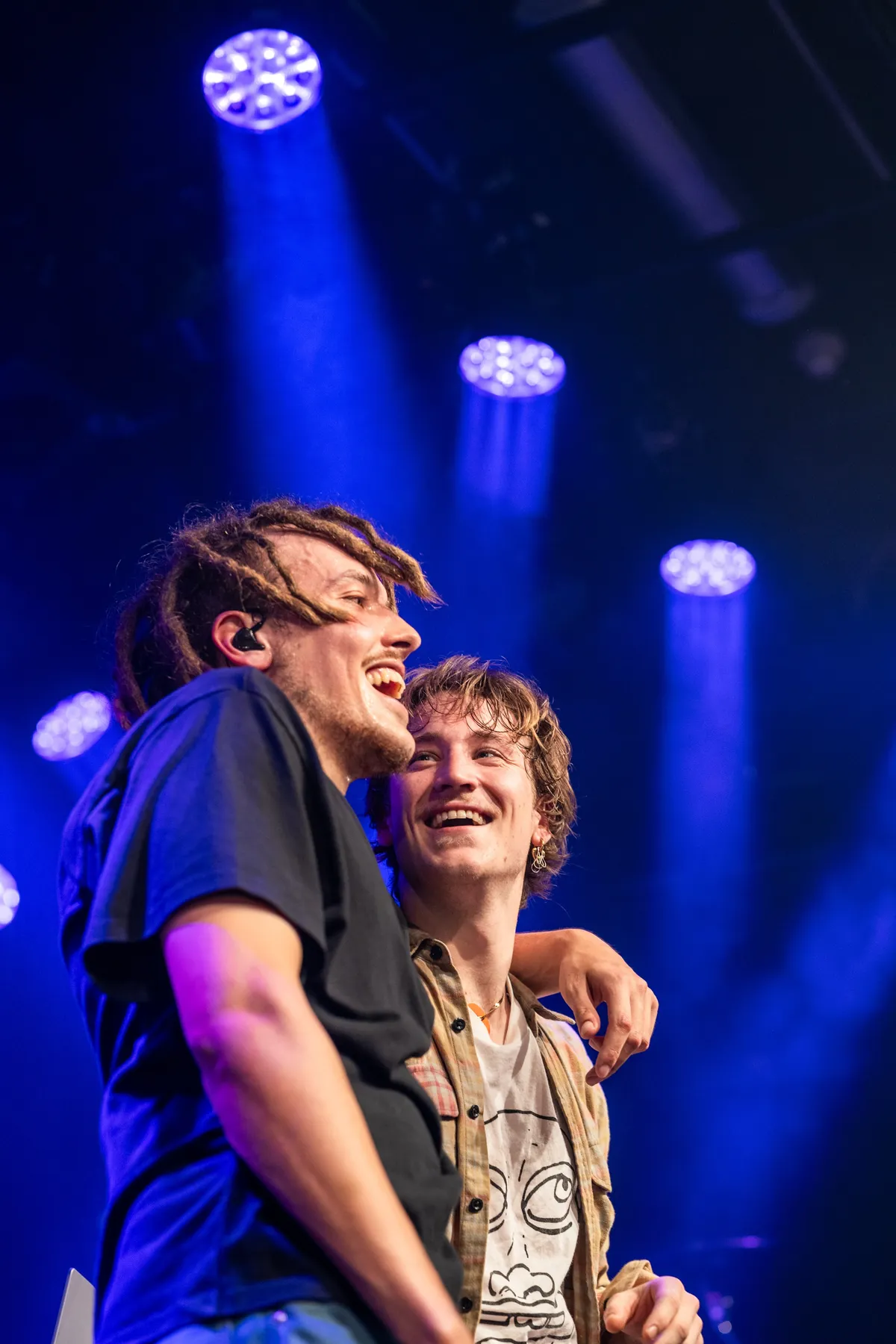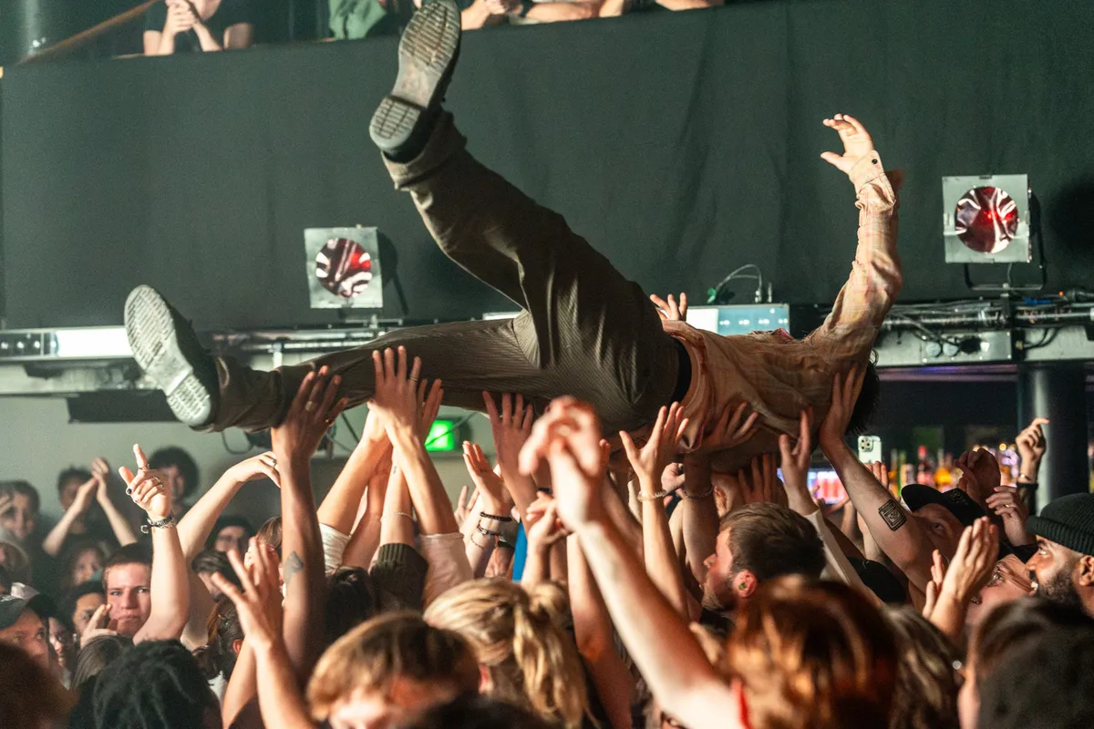 Hup, de bodywarmer gaat uit, hij krijgt een band om zijn broeksprijp zodat ie niet valt tijdens het optreden en het publiek wordt heel hard bedankt dat ze er zijn. Niet alleen onbekende fans, maar ook zijn eigen vrienden en fans zijn er. “Gyatso, lets go!” Verbaasde blikken in de zaal. “Huh, is hij Nederlands? Hij had zo’n Amerikaanse vibe?”