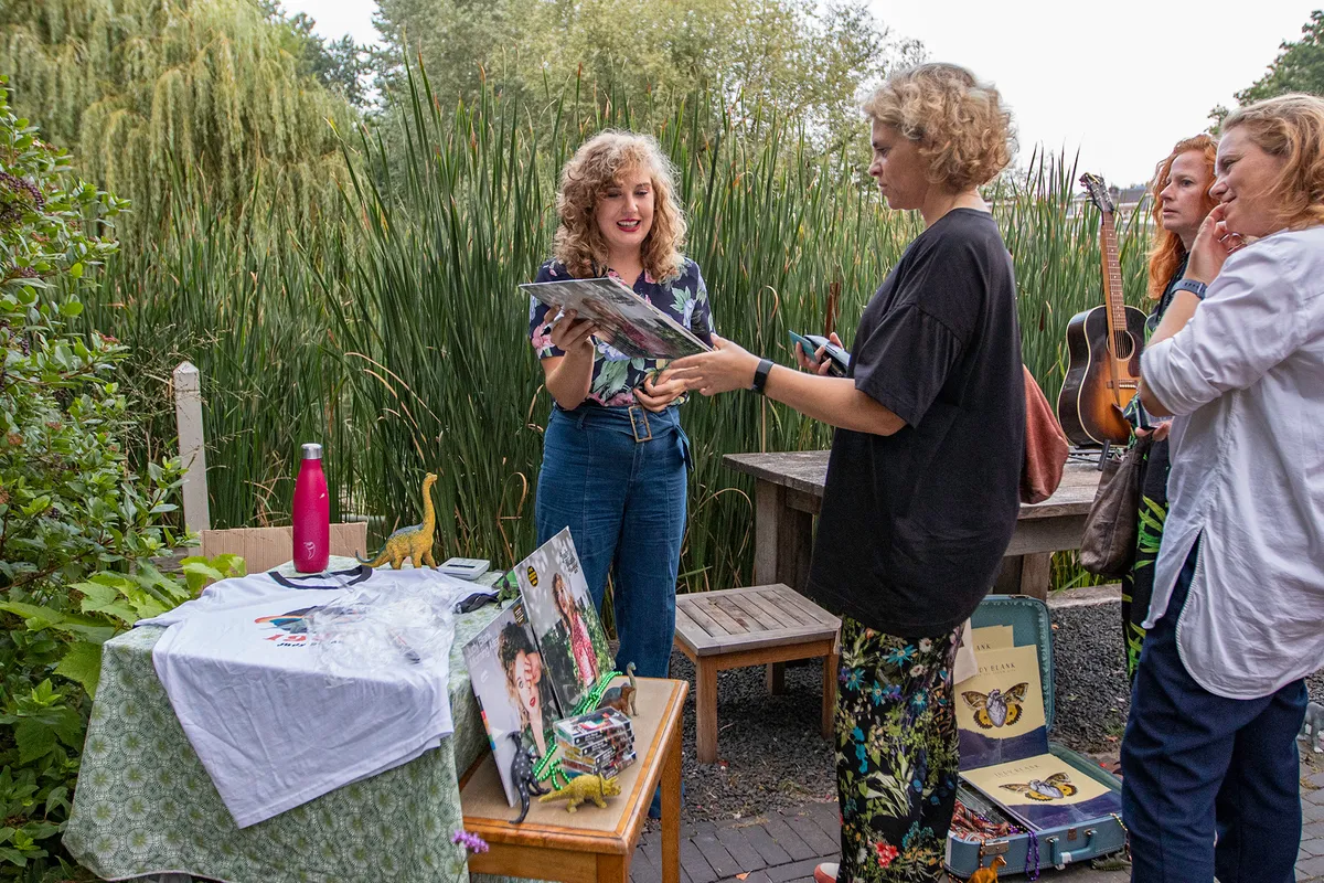 Iedereen praat nog lang na over het optreden van Darlyn tijdens de wandeling naar de volgende locatie. Het is ongeveer een kwartier lopen naar de andere kant van het Vondelpark als we aankomen bij de Oranje Nassaulaan waar Judy Blank zal gaan optreden. De tuin is erg ruim met een prachtig uitzicht over het water en het groen van het Vondelpark. Een schitterende locatie voor een intieme livesessie van deze singer-songwriter uit Utrecht.