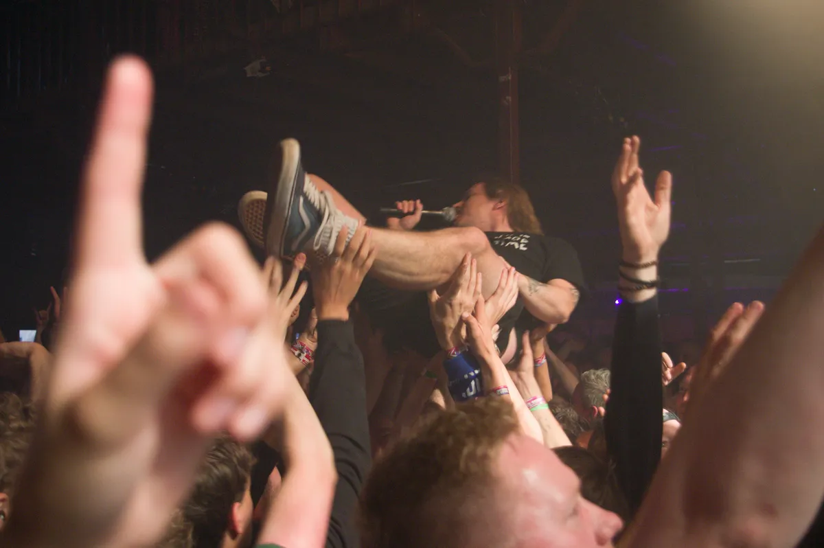 Zoals aangekondigd wordt er tijdens de show nieuw materiaal gespeeld, zoals bijvoorbeeld hun laatste single ‘This Place Is Placeless’ en opener ‘SING and hope it’s out of tune’. Ze worden met open armen ontvangen, maar logischerwijs zijn het de klassiekers die net even wat knallen. Nummers als ‘Oh, Oh, Calamity’, ‘Featherless Redhead’ en ‘Relief’ maken het gekkenhuis compleet. Overal wordt geklommen, gesprongen, gecrowdsurfd, genoten. En als je denkt dat het niet heftiger kan, wordt het drumstel van Carsten naar voren gereden en zet Chris hem in: “B-b-b-broke my neck!” Met ‘Broke Neck’ en ‘Heart Of A Traitor’ wordt een show afgesloten waar dit weekend nog veel over gesproken zal worden. Hier wilde je bij zijn.