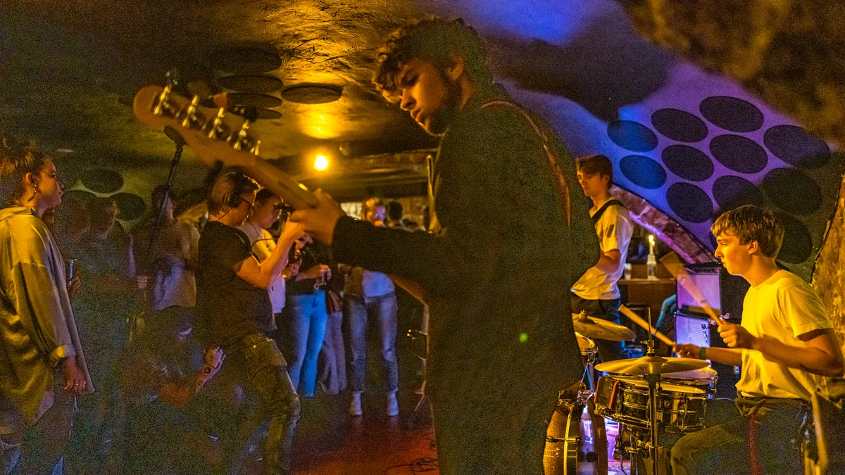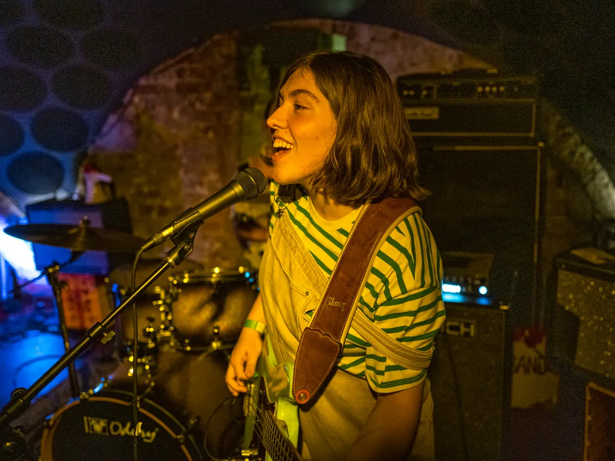 Deveron, ook een Poprondeact, heeft de eer om de kelder van Vera als eerste band in bijna twee jaar weer om te toveren tot een vochtig, klam hol. Een grote verantwoordelijkheid voor de ogenschijnlijk nog jonge groep. Van enige nerveusiteit is echter weinig te bespeuren als de eerste akkoorden worden ingezet. Niet al te ingewikkelde rechttoe-rechtaan muziek die wat weg heeft van IDLES, vult al snel de downstage. De composities zijn niet heel indrukwekkend, maar dit maken ze meer dan goed door het enthousiasme waarmee ze het brengen. Zanger en gitarist Constantijn Houtkamp raakt hierdoor al halverwege de set zijn stem kwijt. Gelukkig vangen de fenomenale drumpartijen van Tom van Giessen dit op. Dit in combinatie met nog wat laatste vocalen die Houtkamp er nog uit weet te persen, zorgen ervoor dat de set toch nog tot een goed einde wordt gebracht. De temperatuur in de kelder is inmiddels aardig gestegen, maar het zweet drupt nog niet van het plafond.